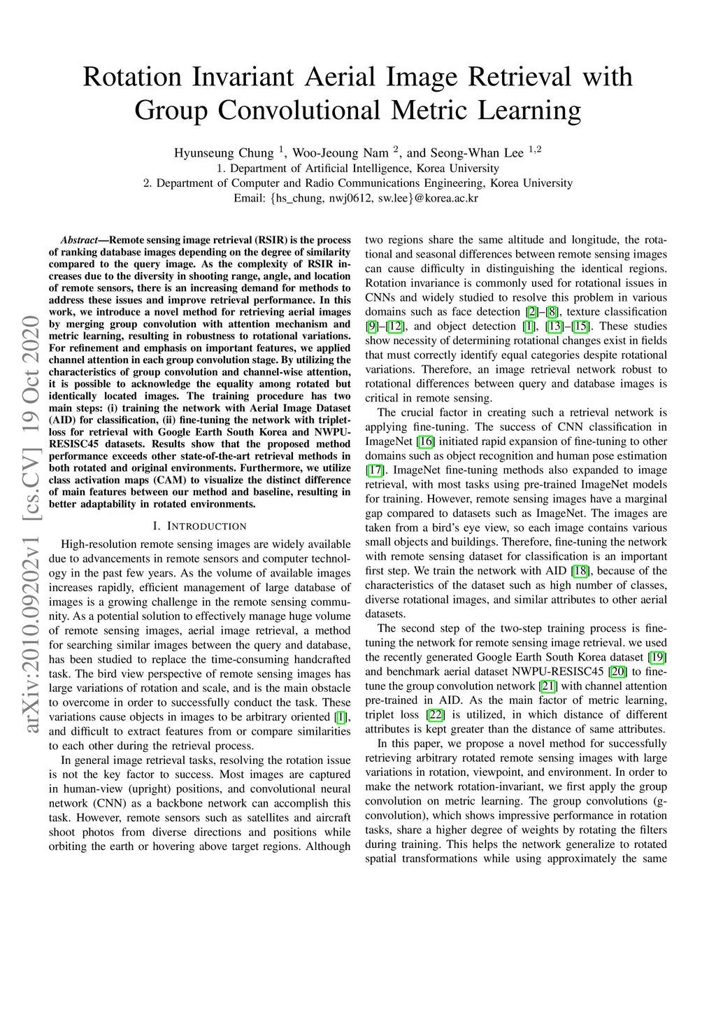 Remote sensing image retrieval (RSIR) is the process of ranking database images depending on the degree of similarity compared to the query image. As the complexity of RSIR increases due to the diversity in shooting range, angle, and location of remote sensors, there is an increasing demand for methods to address these issues and improve retrieval performance. In this work, we introduce a novel method for retrieving aerial images by merging group convolution with attention mechanism and metric learning, resulting in robustness to rotational variations. For refinement and emphasis on important features, we applied channel attention in each group convolution stage. By utilizing the characteristics of group convolution and channel-wise attention, it is possible to acknowledge the equality among rotated but identically located images. The training procedure has two main steps: (i) training the network with Aerial Image Dataset (AID) for classification, (ii) fine-tuning the network with triplet-loss for retrieval with Google Earth South Korea and NWPU-RESISC45 datasets. Results show that the proposed method performance exceeds other state-of-the-art retrieval methods in both rotated and original environments. Furthermore, we utilize class activation maps (CAM) to visualize the distinct difference of main features between our method and baseline, resulting in better adaptability in rotated environments.