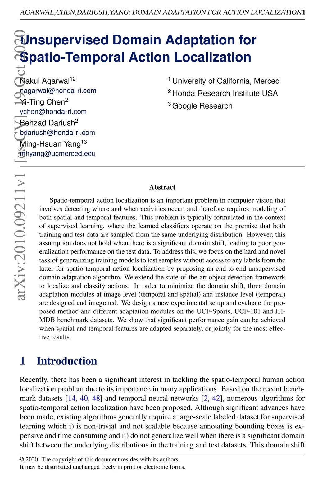 Spatio-temporal action localization is an important problem in computer vision that involves detecting where and when activities occur, and therefore requires modeling of both spatial and temporal features. This problem is typically formulated in the context of supervised learning, where the learned classifiers operate on the premise that both training and test data are sampled from the same underlying distribution. However, this assumption does not hold when there is a significant domain shift, leading to poor generalization performance on the test data. To address this, we focus on the hard and novel task of generalizing training models to test samples without access to any labels from the latter for spatio-temporal action localization by proposing an end-to-end unsupervised domain adaptation algorithm. We extend the state-of-the-art object detection framework to localize and classify actions. In order to minimize the domain shift, three domain adaptation modules at image level (temporal and spatial) and instance level (temporal) are designed and integrated. We design a new experimental setup and evaluate the proposed method and different adaptation modules on the UCF-Sports, UCF-101 and JHMDB benchmark datasets. We show that significant performance gain can be achieved when spatial and temporal features are adapted separately, or jointly for the most effective results.