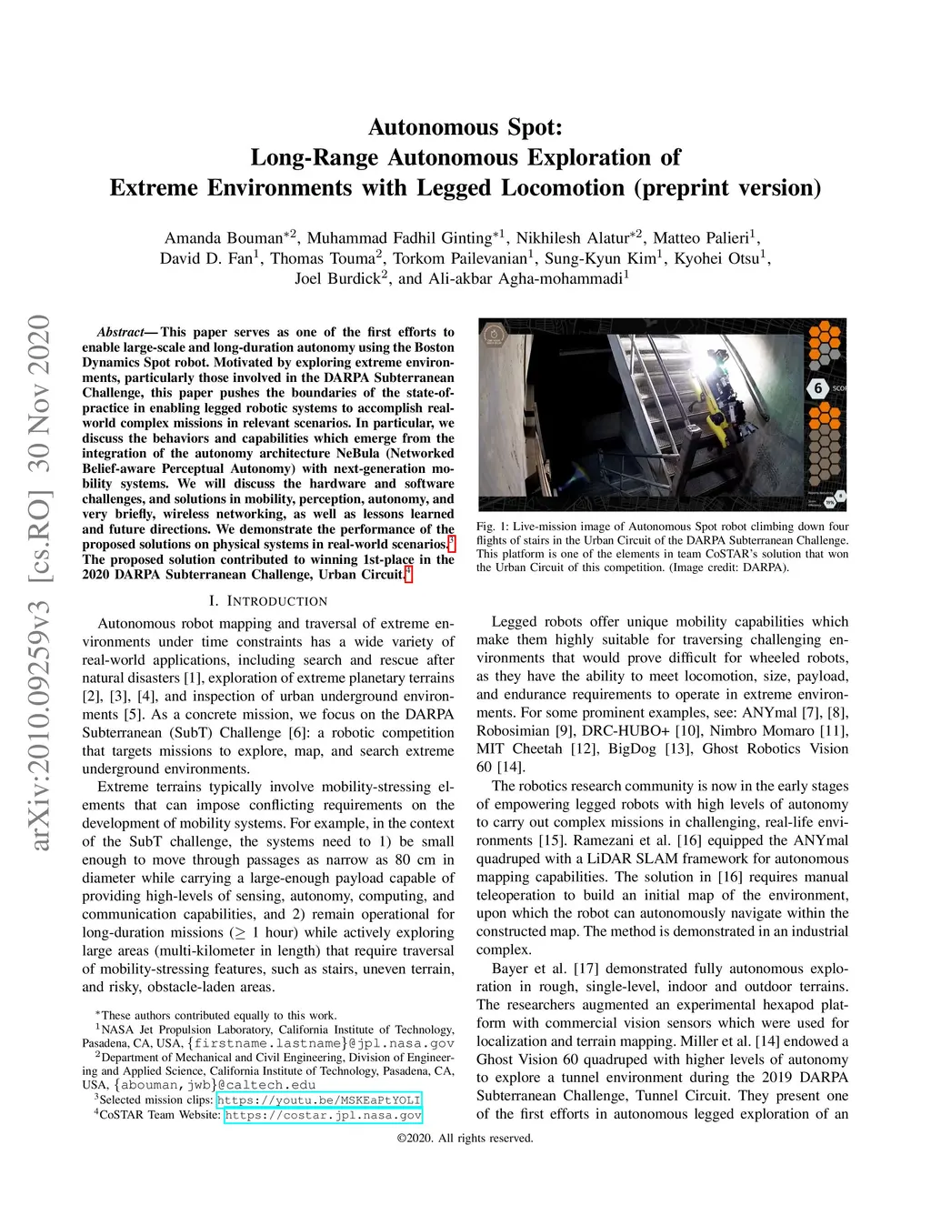 This paper serves as one of the first efforts to enable large-scale and long-duration autonomy using the Boston Dynamics Spot robot. Motivated by exploring extreme environments, particularly those involved in the DARPA Subterranean Challenge, this paper pushes the boundaries of the state-of-practice in enabling legged robotic systems to accomplish real-world complex missions in relevant scenarios. In particular, we discuss the behaviors and capabilities which emerge from the integration of the autonomy architecture NeBula (Networked Belief-aware Perceptual Autonomy) with next-generation mobility systems. We will discuss the hardware and software challenges, and solutions in mobility, perception, autonomy, and very briefly, wireless networking, as well as lessons learned and future directions. We demonstrate the performance of the proposed solutions on physical systems in real-world scenarios.