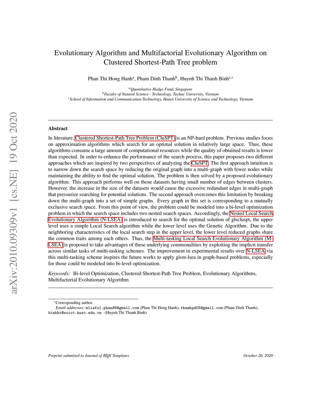 In literature, Clustered Shortest-Path Tree Problem (CluSPT) is an NP-hard problem. Previous studies often search for an optimal solution in relatively large space. To enhance the performance of the search process, two approaches are proposed: the first approach seeks for solutions as a set of edges. From the original graph, we generate a new graph whose vertex set's cardinality is much smaller than that of the original one. Consequently, an effective Evolutionary Algorithm (EA) is proposed for solving CluSPT. The second approach looks for vertex-based solutions. The search space of the CluSPT is transformed into 2 nested search spaces (NSS). With every candidate in the high-level optimization, the search engine in the lower level will find a corresponding candidate to combine with it to create the best solution for CluSPT. Accordingly, Nested Local Search EA (N-LSEA) is introduced to search for the optimal solution on the NSS. When solving this model in lower level by N-LSEA, variety of similar tasks are handled. Thus, Multifactorial Evolutionary Algorithm applied in order to enhance the implicit genetic transfer across these optimizations. Proposed algorithms are conducted on a series of datasets and the obtained results demonstrate superior efficiency in comparison to previous scientific works.