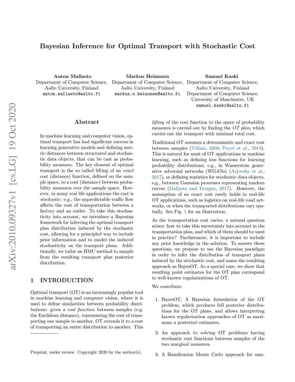 In machine learning and computer vision, optimal transport has had significant success in learning generative models and defining metric distances between structured and stochastic data objects, that can be cast as probability measures. The key element of optimal transport is the so called lifting of an \emph{exact} cost (distance) function, defined on the sample space, to a cost (distance) between probability measures over the sample space. However, in many real life applications the cost is \emph{stochastic}: e.g., the unpredictable traffic flow affects the cost of transportation between a factory and an outlet. To take this stochasticity into account, we introduce a Bayesian framework for inferring the optimal transport plan distribution induced by the stochastic cost, allowing for a principled way to include prior information and to model the induced stochasticity on the transport plans. Additionally, we tailor an HMC method to sample from the resulting transport plan posterior distribution.