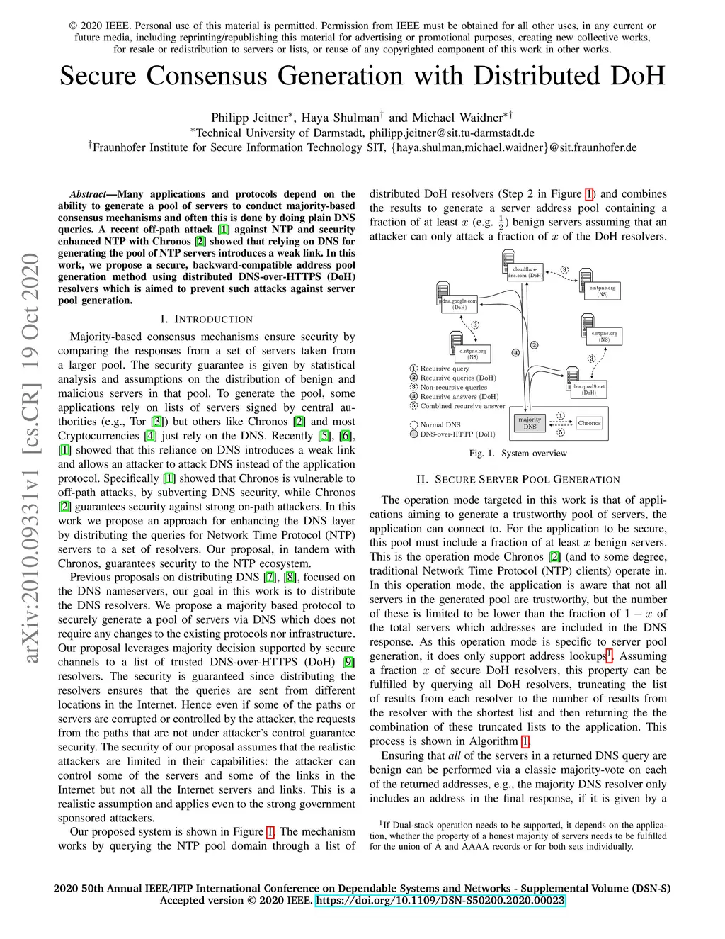 Many applications and protocols depend on the ability to generate a pool of servers to conduct majority-based consensus mechanisms and often this is done by doing plain DNS queries. A recent off-path attack [1] against NTP and security enhanced NTP with Chronos [2] showed that relying on DNS for generating the pool of NTP servers introduces a weak link. In this work, we propose a secure, backward-compatible address pool generation method using distributed DNS-over-HTTPS (DoH) resolvers which is aimed to prevent such attacks against server pool generation.