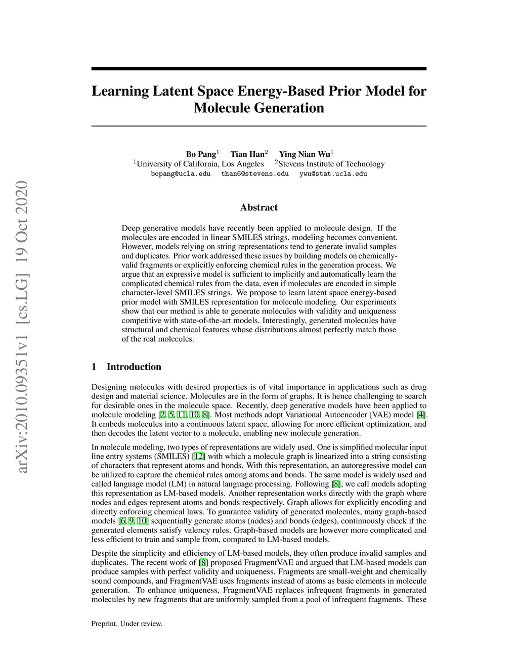 Learning Latent Space Energy-Based Prior Model for Molecule Generation