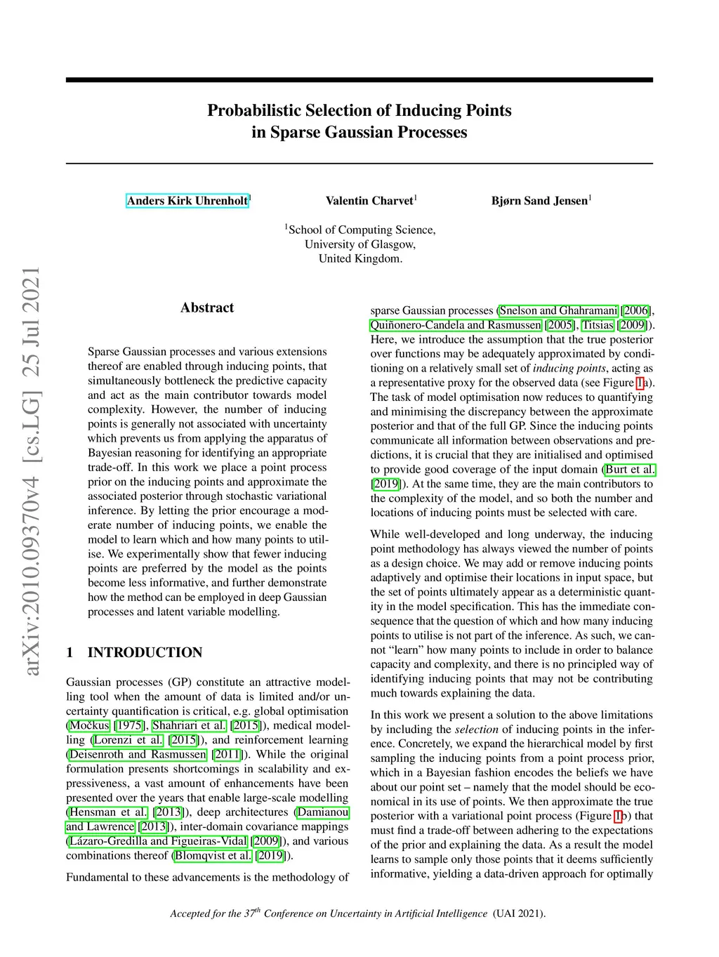Probabilistic selection of inducing points in sparse Gaussian processes