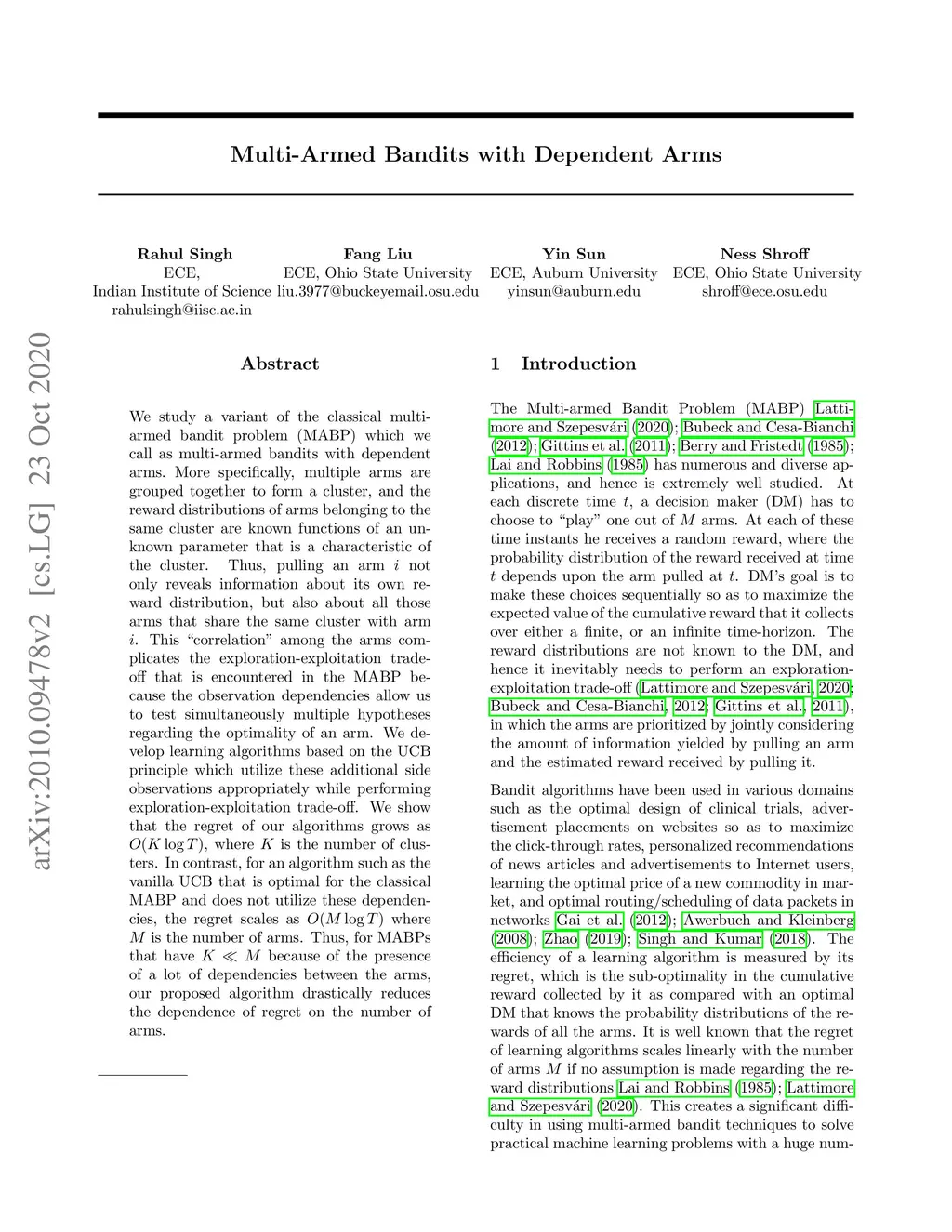We study a variant of the classical multi-armed bandit problem (MABP) which we call as Multi-Armed Bandits with dependent arms. More specifically, multiple arms are grouped together to form a cluster, and the reward distributions of arms belonging to the same cluster are known functions of an unknown parameter that is a characteristic of the cluster. Thus, pulling an arm not only reveals information about its own reward distribution, but also about all those arms that share the same cluster with arm . This "correlation" amongst the arms complicates the exploration-exploitation trade-off that is encountered in the MABP because the observation dependencies allow us to test simultaneously multiple hypotheses regarding the optimality of an arm. We develop learning algorithms based on the UCB principle which utilize these additional side observations appropriately while performing exploration-exploitation trade-off. We show that the regret of our algorithms grows as , where is the number of clusters. In contrast, for an algorithm such as the vanilla UCB that is optimal for the classical MABP and does not utilize these dependencies, the regret scales as where is the number of arms.