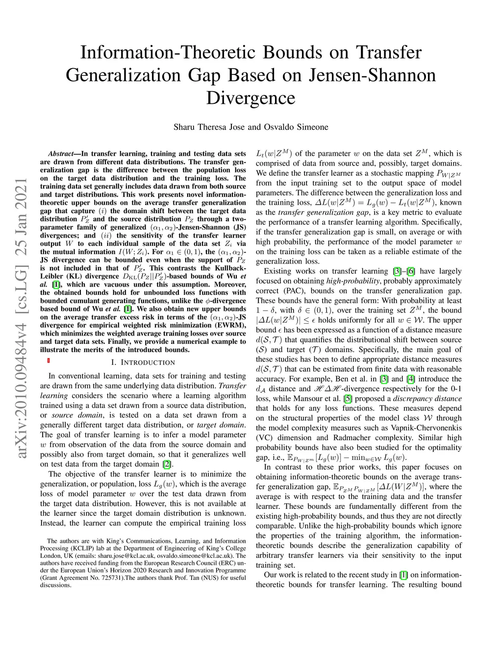 In transfer learning, training and testing data sets are drawn from different data distributions. The transfer generalization gap is the difference between the population loss on the target data distribution and the training loss. The training data set generally includes data drawn from both source and target distributions. This work presents novel information-theoretic upper bounds on the average transfer generalization gap that capture the domain shift between the target data distribution and the source distribution through a two-parameter family of generalized -Jensen-Shannon (JS) divergences; and the sensitivity of the transfer learner output to each individual sample of the data set via the mutual information . For , the -JS divergence can be bounded even when the support of is not included in that of . This contrasts the Kullback-Leibler (KL) divergence -based bounds of Wu et al. [1], which are vacuous under this assumption. Moreover, the obtained bounds hold for unbounded loss functions with bounded cumulant generating functions, unlike the -divergence based bound of Wu et al. [1]. We also obtain new upper bounds on the average transfer excess risk in terms of the -JS divergence for empirical weighted risk minimization (EWRM), which minimizes the weighted average training losses over source and target data sets. Finally, we provide a numerical example to illustrate the merits of the introduced bounds.