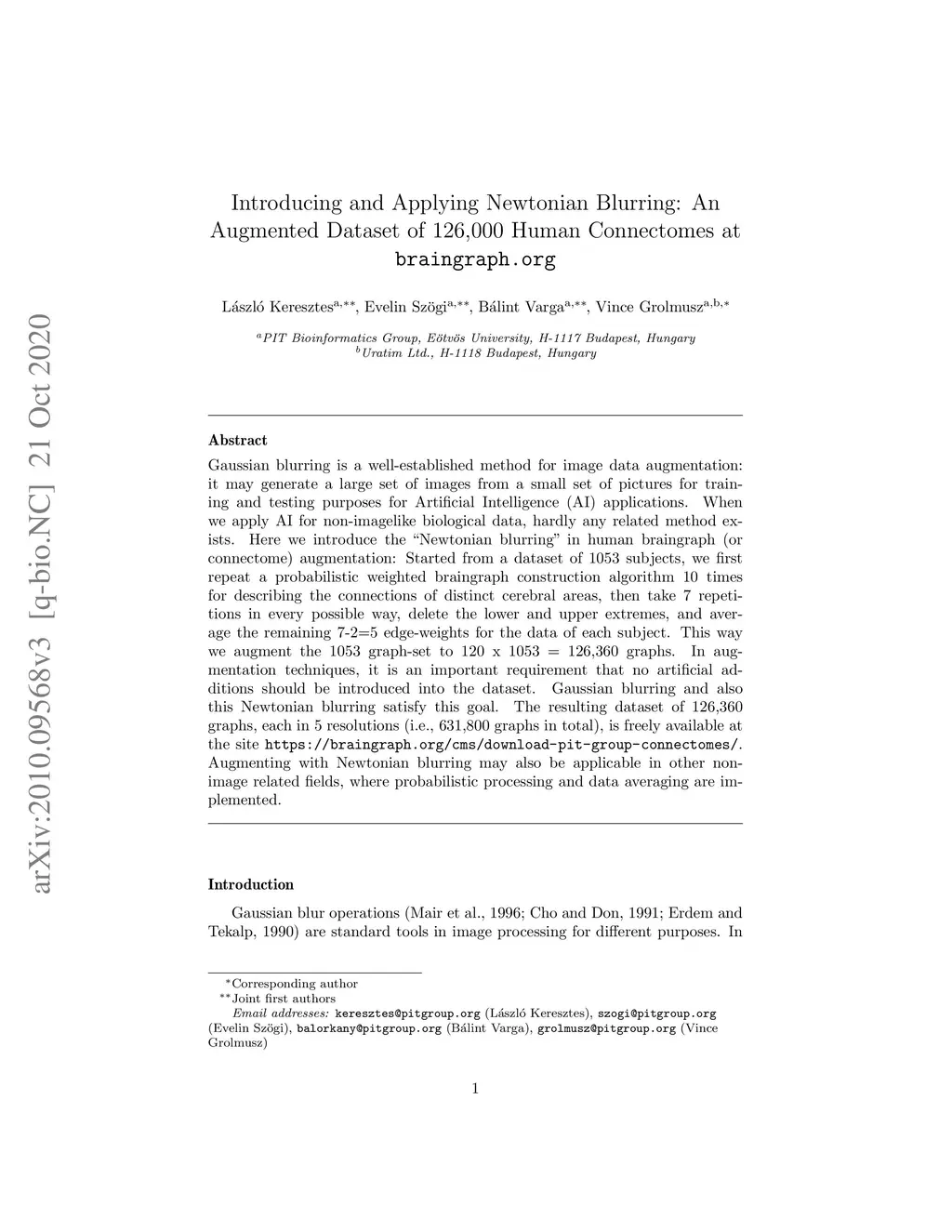 Gaussian blurring is a well-established method for image data augmentation: it may generate a large set of images from a small set of pictures for training and testing purposes for Artificial Intelligence (AI) applications. When we apply AI for non-imagelike biological data, hardly any related method exists. Here we introduce the "Newtonian blurring" in human braingraph (or connectome) augmentation: Started from a dataset of 1053 subjects, we first repeat a probabilistic weighted braingraph construction algorithm 10 times for describing the connections of distinct cerebral areas, then take 7 repetitions in every possible way, delete the lower and upper extremes, and average the remaining 7-2=5 edge-weights for the data of each subject. This way we augment the 1053 graph-set to 120 x 1053 = 126,360 graphs. In augmentation techniques, it is an important requirement that no artificial additions should be introduced into the dataset. Gaussian blurring and also this Newtonian blurring satisfy this goal. The resulting dataset of 126,360 graphs, each in 5 resolutions (i.e., 631,800 graphs in total), is freely available at the site https://braingraph.org/cms/download-pit-group-connectomes/. Augmenting with Newtonian blurring may also be applicable in other non-image related fields, where probabilistic processing and data averaging are implemented.