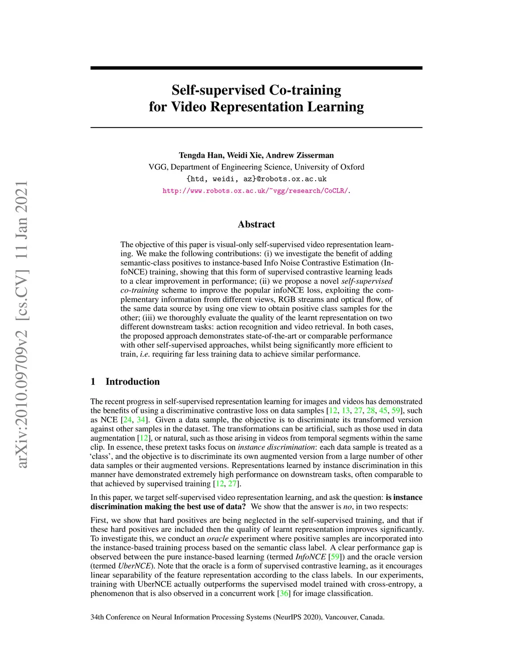 The objective of this paper is visual-only self-supervised video representation learning. We make the following contributions: (i) we investigate the benefit of adding semantic-class positives to instance-based Info Noise Contrastive Estimation (InfoNCE) training, showing that this form of supervised contrastive learning leads to a clear improvement in performance; (ii) we propose a novel self-supervised co-training scheme to improve the popular infoNCE loss, exploiting the complementary information from different views, RGB streams and optical flow, of the same data source by using one view to obtain positive class samples for the other; (iii) we thoroughly evaluate the quality of the learnt representation on two different downstream tasks: action recognition and video retrieval. In both cases, the proposed approach demonstrates state-of-the-art or comparable performance with other self-supervised approaches, whilst being significantly more efficient to train, i.e. requiring far less training data to achieve similar performance.