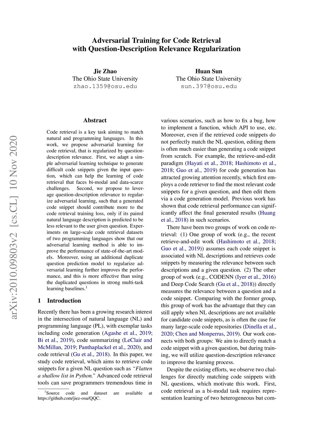 Code retrieval is a key task aiming to match natural and programming languages. In this work, we propose adversarial learning for code retrieval, that is regularized by question-description relevance. First, we adapt a simple adversarial learning technique to generate difficult code snippets given the input question, which can help the learning of code retrieval that faces bi-modal and data-scarce challenges. Second, we propose to leverage question-description relevance to regularize adversarial learning, such that a generated code snippet should contribute more to the code retrieval training loss, only if its paired natural language description is predicted to be less relevant to the user given question. Experiments on large-scale code retrieval datasets of two programming languages show that our adversarial learning method is able to improve the performance of state-of-the-art models. Moreover, using an additional duplicate question prediction model to regularize adversarial learning further improves the performance, and this is more effective than using the duplicated questions in strong multi-task learning baselines