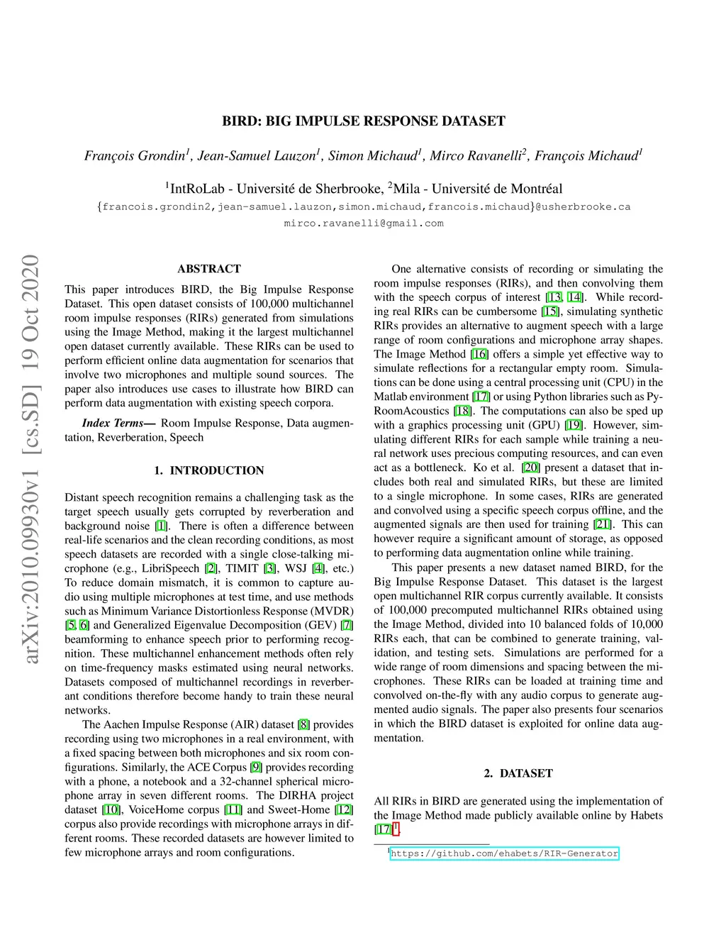 This paper introduces BIRD, the Big Impulse Response Dataset. This open dataset consists of 100,000 multichannel room impulse responses (RIRs) generated from simulations using the Image Method, making it the largest multichannel open dataset currently available. These RIRs can be used toperform efficient online data augmentation for scenarios that involve two microphones and multiple sound sources. The paper also introduces use cases to illustrate how BIRD can perform data augmentation with existing speech corpora.