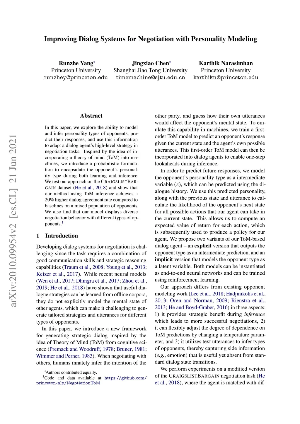In this paper, we explore the ability to model and infer personality types of opponents, predict their responses, and use this information to adapt a dialog agent's high-level strategy in negotiation tasks. Inspired by the idea of incorporating a theory of mind (ToM) into machines, we introduce a probabilistic formulation to encapsulate the opponent's personality type during both learning and inference. We test our approach on the CraigslistBargain dataset and show that our method using ToM inference achieves a 20% higher dialog agreement rate compared to baselines on a mixed population of opponents. We also find that our model displays diverse negotiation behavior with different types of opponents.