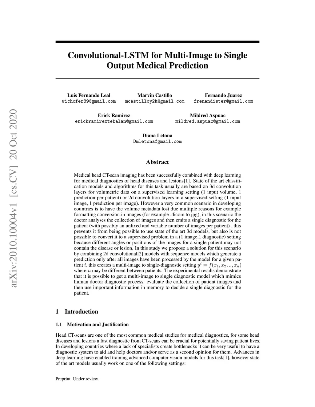 Medical head CT-scan imaging has been successfully combined with deep learning for medical diagnostics of head diseases and lesions[1]. State of the art classification models and algorithms for this task usually are based on 3d convolution layers for volumetric data on a supervised learning setting (1 input volume, 1 prediction per patient) or 2d convolution layers in a supervised setting (1 input image, 1 prediction per image). However a very common scenario in developing countries is to have the volume metadata lost due multiple reasons for example formatting conversion in images (for example .dicom to jpg), in this scenario the doctor analyses the collection of images and then emits a single diagnostic for the patient (with possibly an unfixed and variable number of images per patient) , this prevents it from being possible to use state of the art 3d models, but also is not possible to convert it to a supervised problem in a (1 image,1 diagnostic) setting because different angles or positions of the images for a single patient may not contain the disease or lesion. In this study we propose a solution for this scenario by combining 2d convolutional[2] models with sequence models which generate a prediction only after all images have been processed by the model for a given patient \(i\), this creates a multi-image to single-diagnostic setting \(y^i=f(x_1,x_2,..,x_n)\) where \(n\) may be different between patients. The experimental results demonstrate that it is possible to get a multi-image to single diagnostic model which mimics human doctor diagnostic process: evaluate the collection of patient images and then use important information in memory to decide a single diagnostic for the patient.