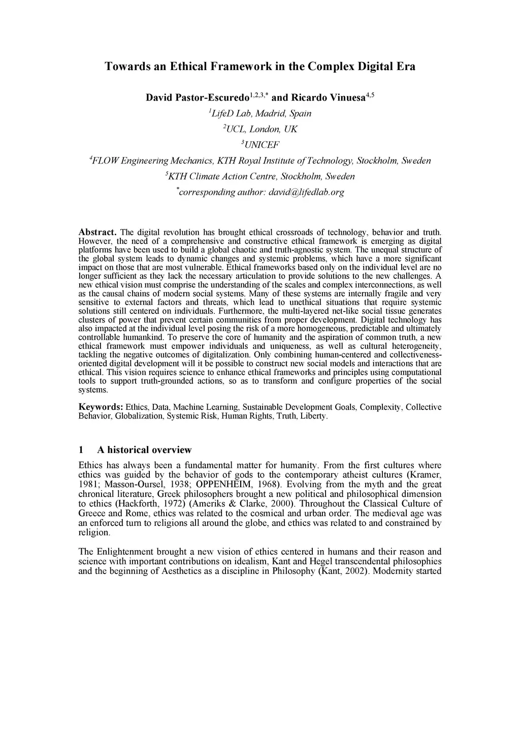 The digital revolution has brought ethical crossroads of technology, behavior and truth. However, the need of a comprehensive and constructive ethical framework is emerging as digital platforms have been used to build a global chaotic and truth-agnostic system. The unequal structure of the global system leads to dynamic changes and systemic problems, which have a more significant impact on those that are most vulnerable. Ethical frameworks based only on the individual level are no longer sufficient as they lack the necessary articulation to provide solutions to the new challenges. A new ethical vision must comprise the understanding of the scales and complex interconnections, as well as the causal chains of modern social systems. Many of these systems are internally fragile and very sensitive to external factors and threats, which lead to unethical situations that require systemic solutions still centered on individuals. Furthermore, the multi-layered net-like social tissue generates clusters of power that prevent certain communities from proper development. Digital technology has also impacted at the individual level posing the risk of a more homogeneous, predictable and ultimately controllable humankind. To preserve the core of humanity and the aspiration of common truth, a new ethical framework must empower individuals and uniqueness, as well as cultural heterogeneity, tackling the negative outcomes of digitalization. Only combining human-centered and collectiveness-oriented digital development will it be possible to construct new social models and interactions that are ethical. This vision requires science to enhance ethical frameworks and principles using computational tools to support truth-grounded actions, so as to transform and configure properties of the social systems.