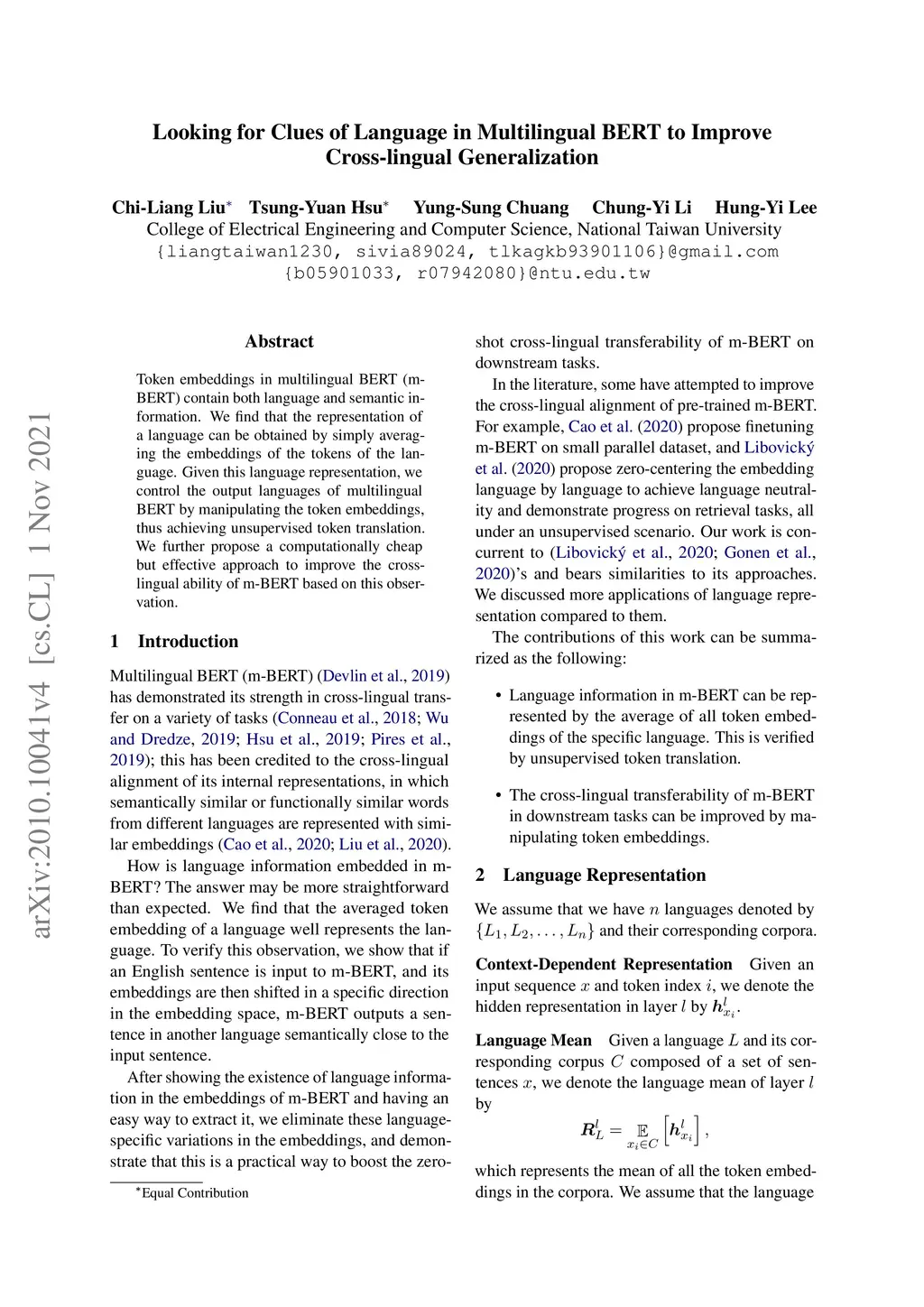 Token embeddings in multilingual BERT (m-BERT) contain both language and semantic information. We find that the representation of a language can be obtained by simply averaging the embeddings of the tokens of the language. Given this language representation, we control the output languages of multilingual BERT by manipulating the token embeddings, thus achieving unsupervised token translation. We further propose a computationally cheap but effective approach to improve the cross-lingual ability of m-BERT based on this observation.