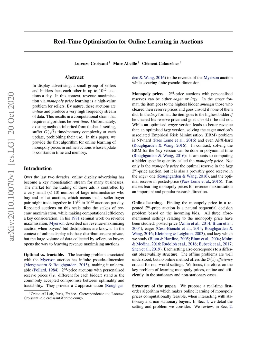 In display advertising, a small group of sellers and bidders face each other in up to 10 12 auctions a day. In this context, revenue maximisation via monopoly price learning is a high-value problem for sellers. By nature, these auctions are online and produce a very high frequency stream of data. This results in a computational strain that requires algorithms be real-time. Unfortunately, existing methods inherited from the batch setting suffer O() time/memory complexity at each update, prohibiting their use. In this paper, we provide the first algorithm for online learning of monopoly prices in online auctions whose update is constant in time and memory.