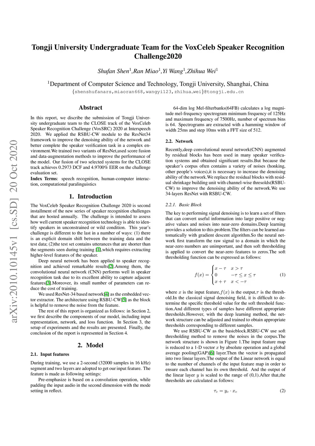 In this report, we discribe the submission of Tongji University undergraduate team to the CLOSE track of the VoxCeleb Speaker Recognition Challenge (VoxSRC) 2020 at Interspeech 2020. We applied the RSBU-CW module to the ResNet34 framework to improve the denoising ability of the network and better complete the speaker verification task in a complex environment.We trained two variants of ResNet,used score fusion and data-augmentation methods to improve the performance of the model. Our fusion of two selected systems for the CLOSE track achieves 0.2973 DCF and 4.9700\% EER on the challenge evaluation set.
