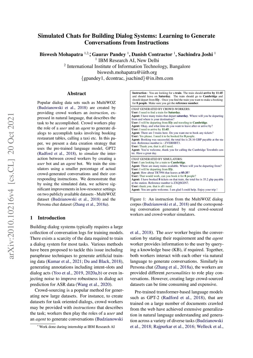 Popular dialog datasets such as MultiWOZ are created by providing crowd workers an instruction, expressed in natural language, that describes the task to be accomplished. Crowd workers play the role of a user and an agent to generate dialogs to accomplish tasks involving booking restaurant tables, calling a taxi etc. In this paper, we present a data creation strategy that uses the pre-trained language model, GPT2, to simulate the interaction between crowd workers by creating a user bot and an agent bot. We train the simulators using a smaller percentage of actual crowd-generated conversations and their corresponding instructions. We demonstrate that by using the simulated data, we achieve significant improvements in low-resource settings on two publicly available datasets - the MultiWOZ dataset and the Persona chat dataset.