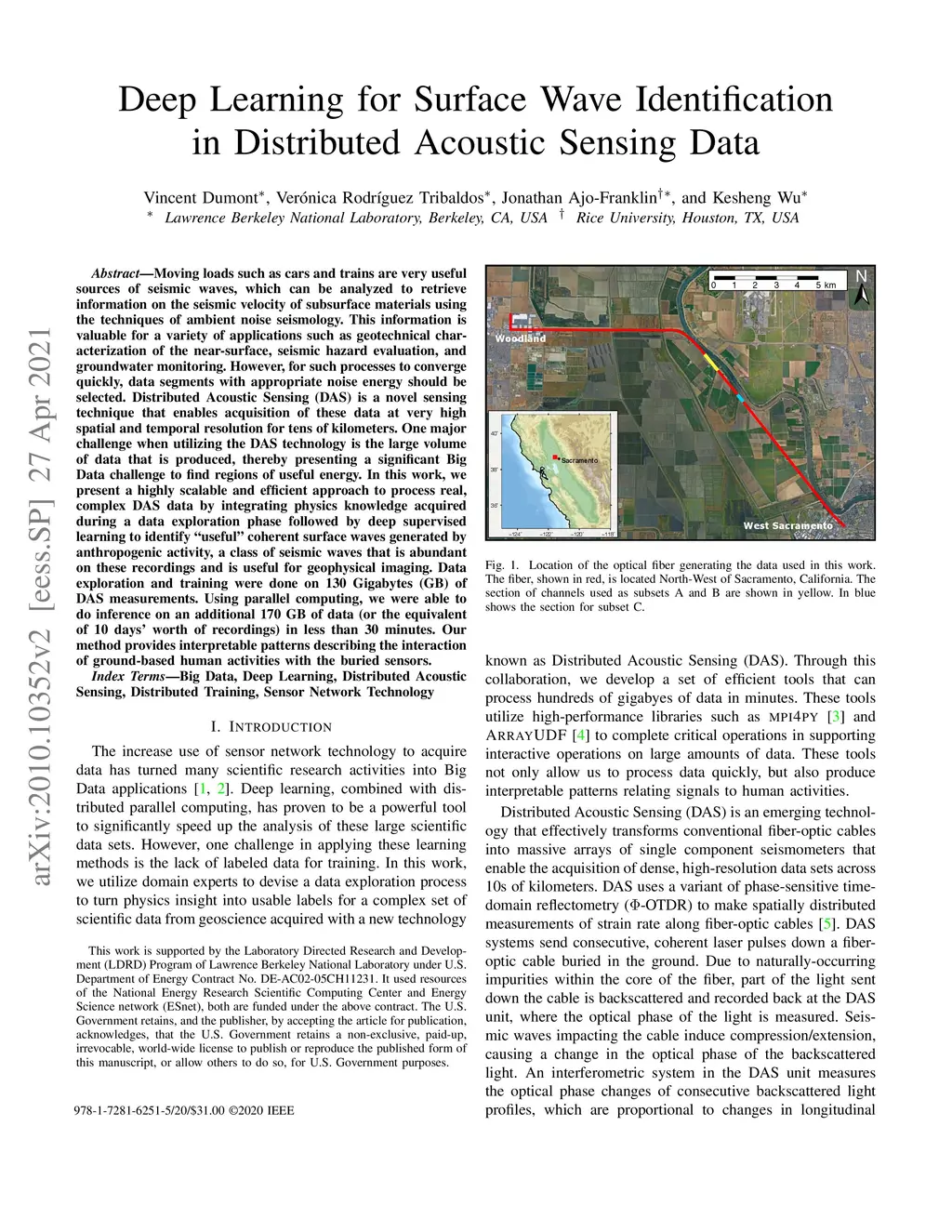 Moving loads such as cars and trains are very useful sources of seismic waves, which can be analyzed to retrieve information on the seismic velocity of subsurface materials using the techniques of ambient noise seismology. This information is valuable for a variety of applications such as geotechnical characterization of the near-surface, seismic hazard evaluation, and groundwater monitoring. However, for such processes to converge quickly, data segments with appropriate noise energy should be selected. Distributed Acoustic Sensing (DAS) is a novel sensing technique that enables acquisition of these data at very high spatial and temporal resolution for tens of kilometers. One major challenge when utilizing the DAS technology is the large volume of data that is produced, thereby presenting a significant Big Data challenge to find regions of useful energy. In this work, we present a highly scalable and efficient approach to process real, complex DAS data by integrating physics knowledge acquired during a data exploration phase followed by deep supervised learning to identify "useful" coherent surface waves generated by anthropogenic activity, a class of seismic waves that is abundant on these recordings and is useful for geophysical imaging. Data exploration and training were done on 130~Gigabytes (GB) of DAS measurements. Using parallel computing, we were able to do inference on an additional 170~GB of data (or the equivalent of 10 days' worth of recordings) in less than 30 minutes. Our method provides interpretable patterns describing the interaction of ground-based human activities with the buried sensors.