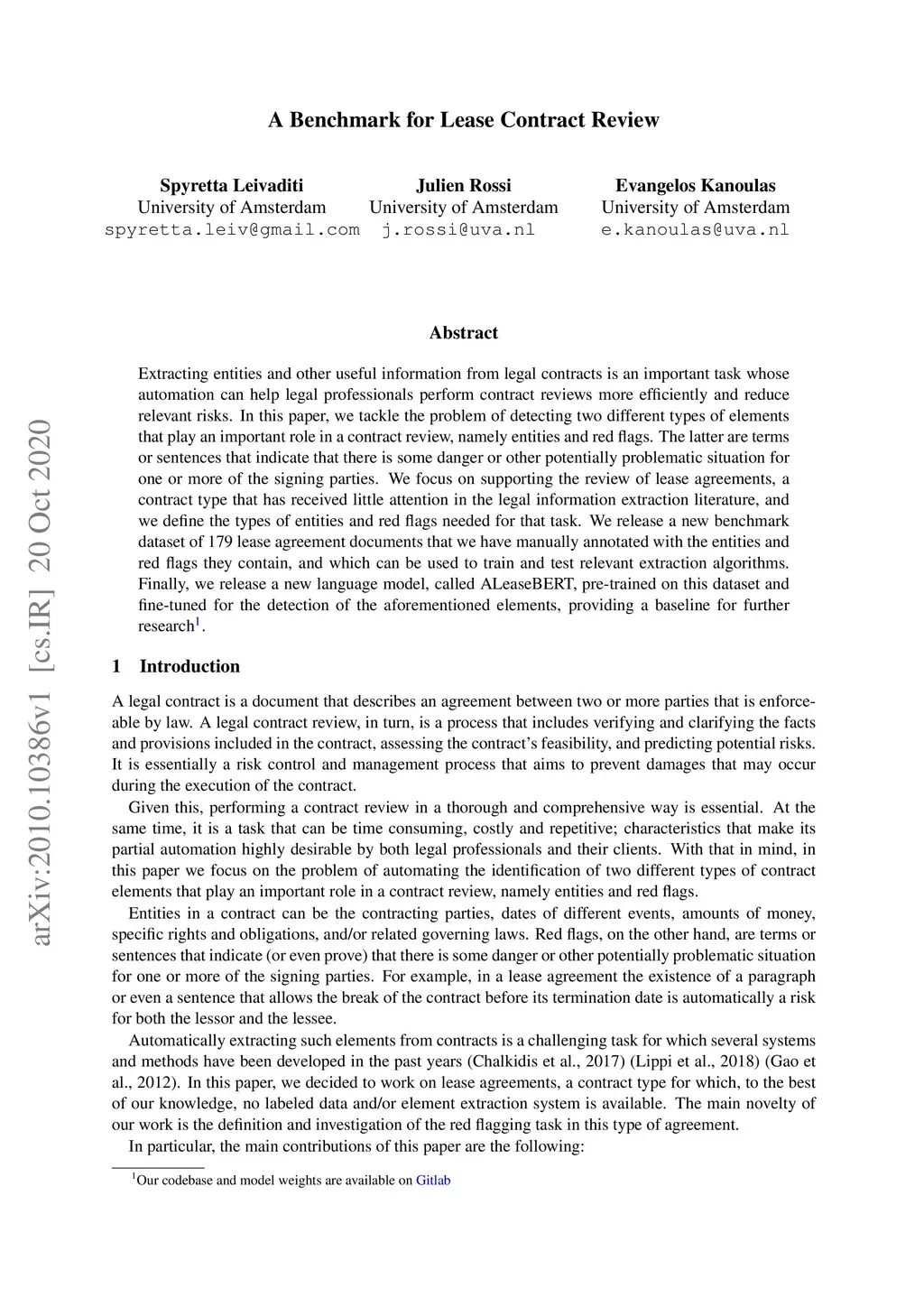 Extracting entities and other useful information from legal contracts is an important task whose automation can help legal professionals perform contract reviews more efficiently and reduce relevant risks. In this paper, we tackle the problem of detecting two different types of elements that play an important role in a contract review, namely entities and red flags. The latter are terms or sentences that indicate that there is some danger or other potentially problematic situation for one or more of the signing parties. We focus on supporting the review of lease agreements, a contract type that has received little attention in the legal information extraction literature, and we define the types of entities and red flags needed for that task. We release a new benchmark dataset of 179 lease agreement documents that we have manually annotated with the entities and red flags they contain, and which can be used to train and test relevant extraction algorithms. Finally, we release a new language model, called ALeaseBERT, pre-trained on this dataset and fine-tuned for the detection of the aforementioned elements, providing a baseline for further research