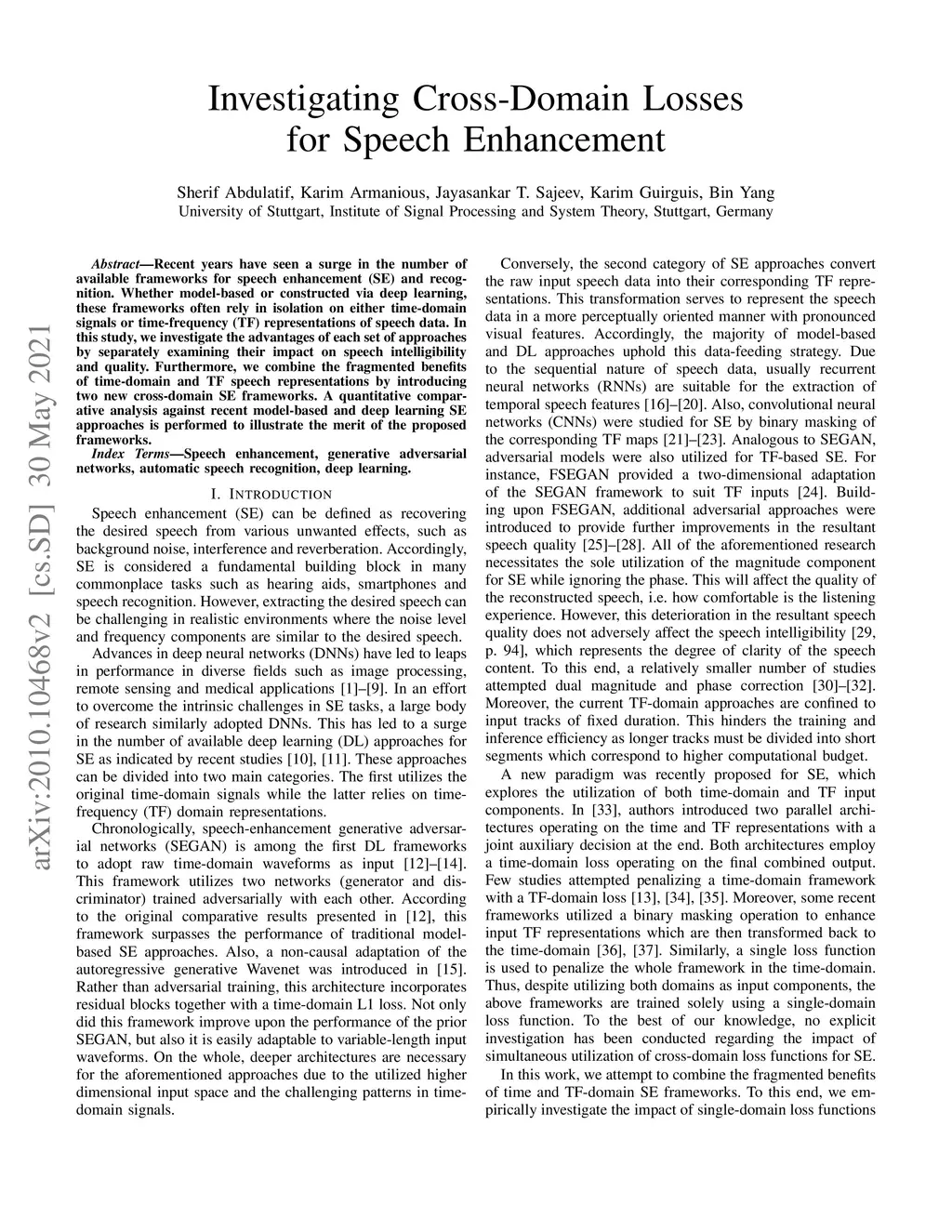 Recent years have seen a surge in the number of available frameworks for speech enhancement (SE) and recognition. Whether model-based or constructed via deep learning, these frameworks often rely in isolation on either time-domain signals or time-frequency (TF) representations of speech data. In this study, we investigate the advantages of each set of approaches by separately examining their impact on speech intelligibility and quality. Furthermore, we combine the fragmented benefits of time-domain and TF speech representations by introducing two new cross-domain SE frameworks. A quantitative comparative analysis against recent model-based and deep learning SE approaches is performed to illustrate the merit of the proposed frameworks.