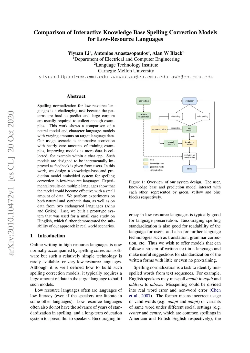 Spelling normalization for low resource languages is a challenging task because the patterns are hard to predict and large corpora are usually required to collect enough examples. This work shows a comparison of a neural model and character language models with varying amounts on target language data. Our usage scenario is interactive correction with nearly zero amounts of training examples, improving models as more data is collected, for example within a chat app. Such models are designed to be incrementally improved as feedback is given from users. In this work, we design a knowledge-base and prediction model embedded system for spelling correction in low-resource languages. Experimental results on multiple languages show that the model could become effective with a small amount of data. We perform experiments on both natural and synthetic data, as well as on data from two endangered languages (Ainu and Griko). Last, we built a prototype system that was used for a small case study on Hinglish, which further demonstrated the suitability of our approach in real world scenarios.