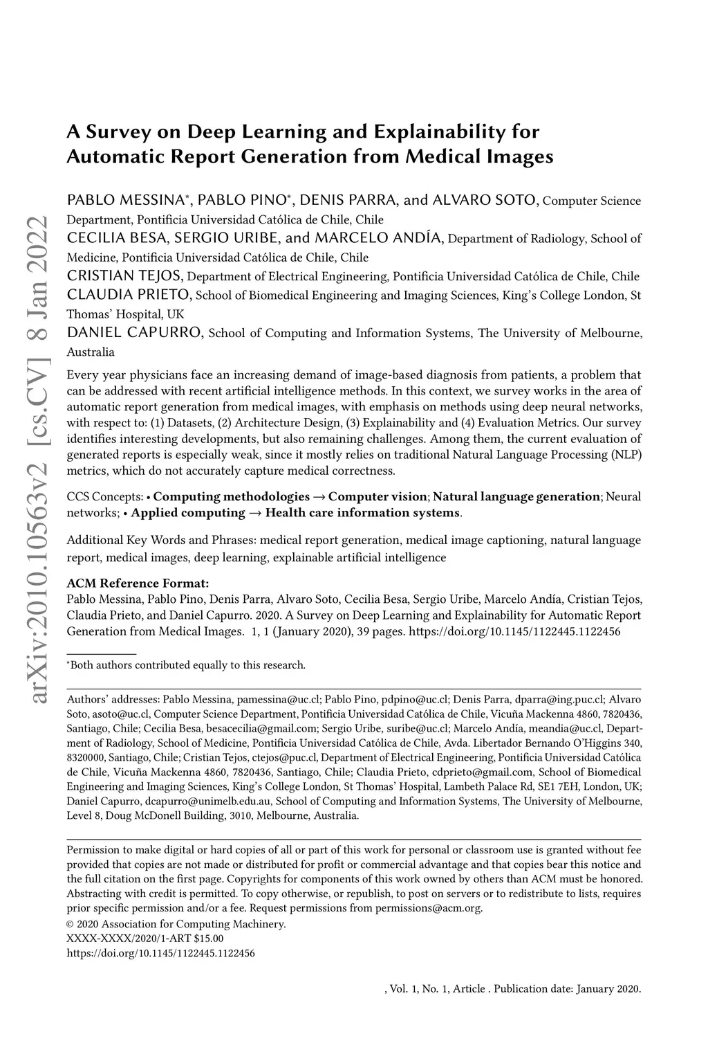 Every year physicians face an increasing demand of image-based diagnosis from patients, a problem that can be addressed with recent artificial intelligence methods. In this context, we survey works in the area of automatic report generation from medical images, with emphasis on methods using deep neural networks, with respect to: (1) Datasets, (2) Architecture Design, (3) Explainability and (4) Evaluation Metrics. Our survey identifies interesting developments, but also remaining challenges. Among them, the current evaluation of generated reports is especially weak, since it mostly relies on traditional Natural Language Processing (NLP) metrics, which do not accurately capture medical correctness.