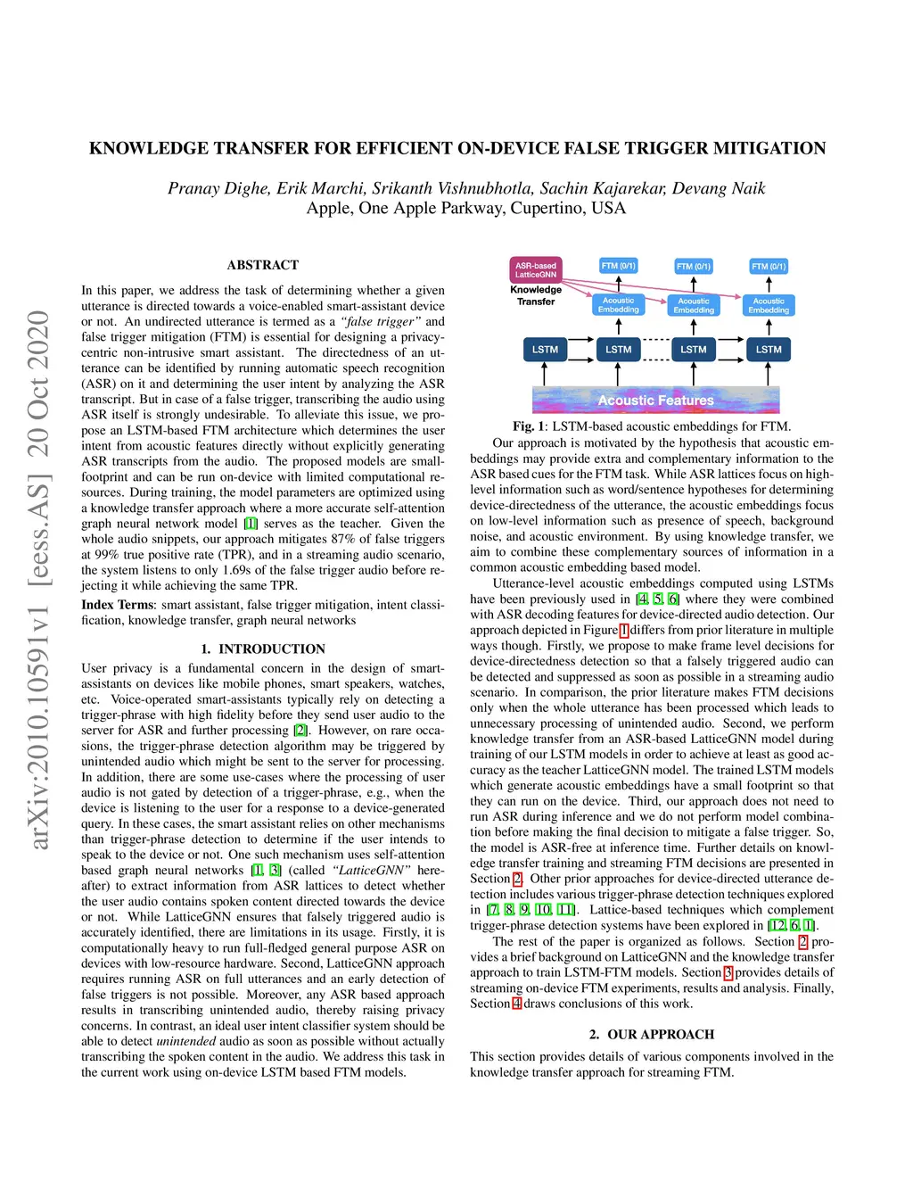 In this paper, we address the task of determining whether a given utterance is directed towards a voice-enabled smart-assistant device or not. An undirected utterance is termed as a "false trigger" and false trigger mitigation (FTM) is essential for designing a privacy-centric non-intrusive smart assistant. The directedness of an utterance can be identified by running automatic speech recognition (ASR) on it and determining the user intent by analyzing the ASR transcript. But in case of a false trigger, transcribing the audio using ASR itself is strongly undesirable. To alleviate this issue, we propose an LSTM-based FTM architecture which determines the user intent from acoustic features directly without explicitly generating ASR transcripts from the audio. The proposed models are small footprint and can be run on-device with limited computational resources. During training, the model parameters are optimized using a knowledge transfer approach where a more accurate self-attention graph neural network model serves as the teacher. Given the whole audio snippets, our approach mitigates 87% of false triggers at 99% true positive rate (TPR), and in a streaming audio scenario, the system listens to only 1.69s of the false trigger audio before rejecting it while achieving the same TPR.
