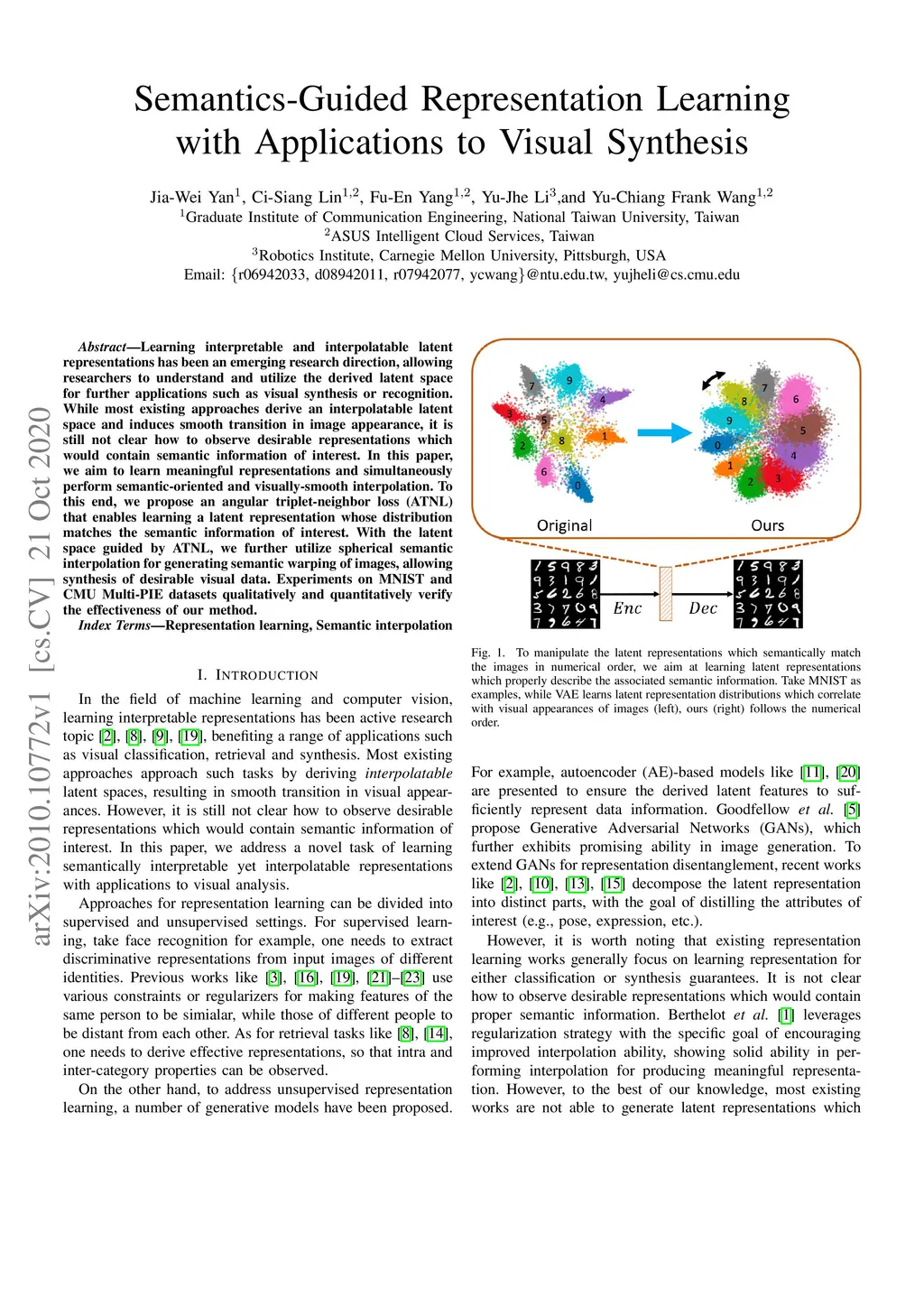 Learning interpretable and interpolatable latent representations has been an emerging research direction, allowing researchers to understand and utilize the derived latent space for further applications such as visual synthesis or recognition. While most existing approaches derive an interpolatable latent space and induces smooth transition in image appearance, it is still not clear how to observe desirable representations which would contain semantic information of interest. In this paper, we aim to learn meaningful representations and simultaneously perform semantic-oriented and visually-smooth interpolation. To this end, we propose an angular triplet-neighbor loss (ATNL) that enables learning a latent representation whose distribution matches the semantic information of interest. With the latent space guided by ATNL, we further utilize spherical semantic interpolation for generating semantic warping of images, allowing synthesis of desirable visual data. Experiments on MNIST and CMU Multi-PIE datasets qualitatively and quantitatively verify the effectiveness of our method.