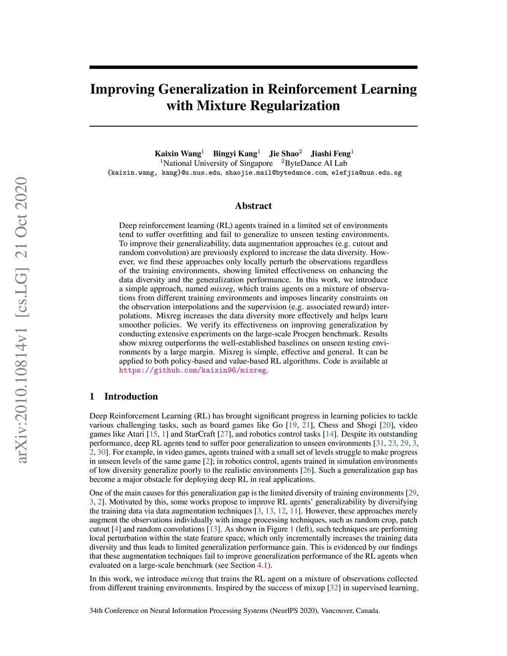 Deep reinforcement learning (RL) agents trained in a limited set of environments tend to suffer overfitting and fail to generalize to unseen testing environments. To improve their generalizability, data augmentation approaches (e.g. cutout and random convolution) are previously explored to increase the data diversity. However, we find these approaches only locally perturb the observations regardless of the training environments, showing limited effectiveness on enhancing the data diversity and the generalization performance. In this work, we introduce a simple approach, named mixreg, which trains agents on a mixture of observations from different training environments and imposes linearity constraints on the observation interpolations and the supervision (e.g. associated reward) interpolations. Mixreg increases the data diversity more effectively and helps learn smoother policies. We verify its effectiveness on improving generalization by conducting extensive experiments on the large-scale Procgen benchmark. Results show mixreg outperforms the well-established baselines on unseen testing environments by a large margin. Mixreg is simple, effective and general. It can be applied to both policy-based and value-based RL algorithms. Code is available at https://github.com/kaixin96/mixreg .