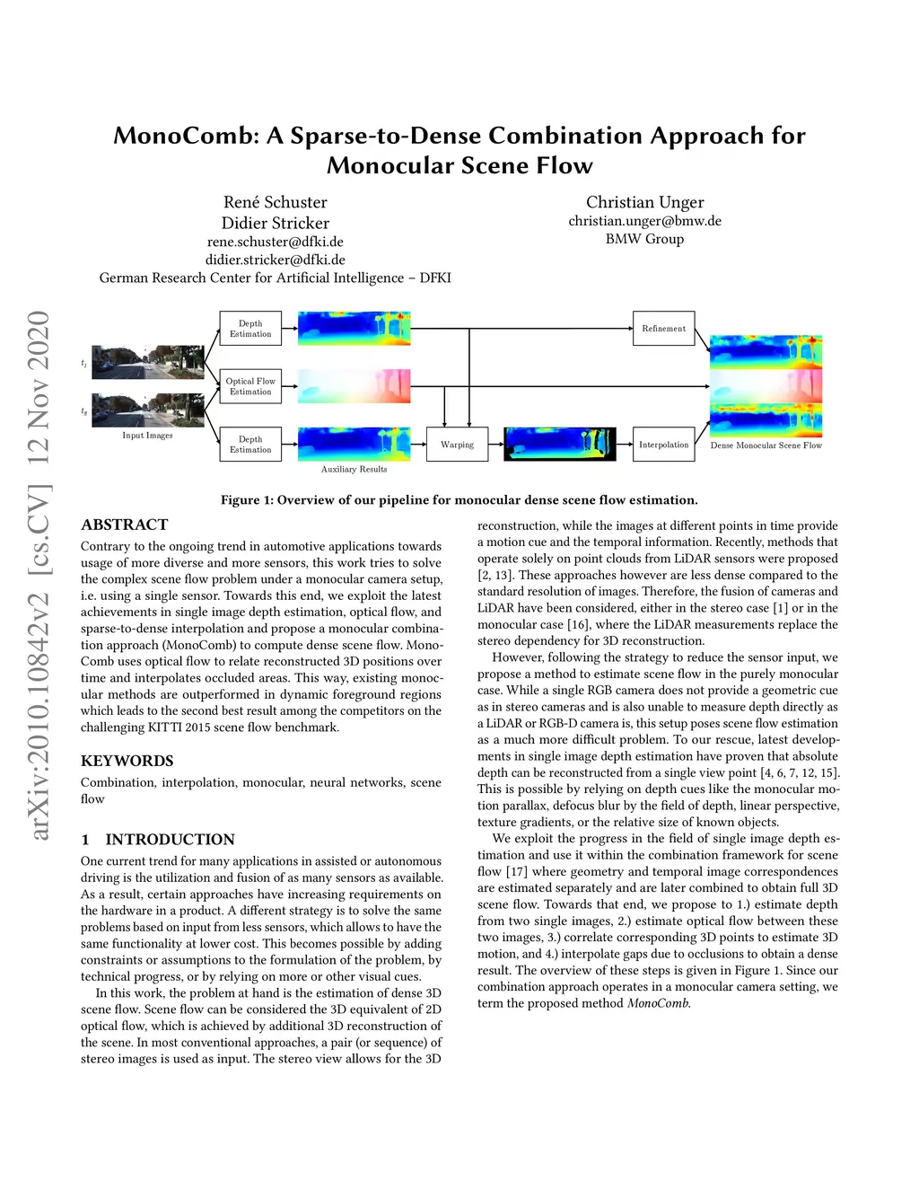 Contrary to the ongoing trend in automotive applications towards usage of more diverse and more sensors, this work tries to solve the complex scene flow problem under a monocular camera setup, i.e. using a single sensor. Towards this end, we exploit the latest achievements in single image depth estimation, optical flow, and sparse-to-dense interpolation and propose a monocular combination approach (MonoComb) to compute dense scene flow. MonoComb uses optical flow to relate reconstructed 3D positions over time and interpolates occluded areas. This way, existing monocular methods are outperformed in dynamic foreground regions which leads to the second best result among the competitors on the challenging KITTI 2015 scene flow benchmark.