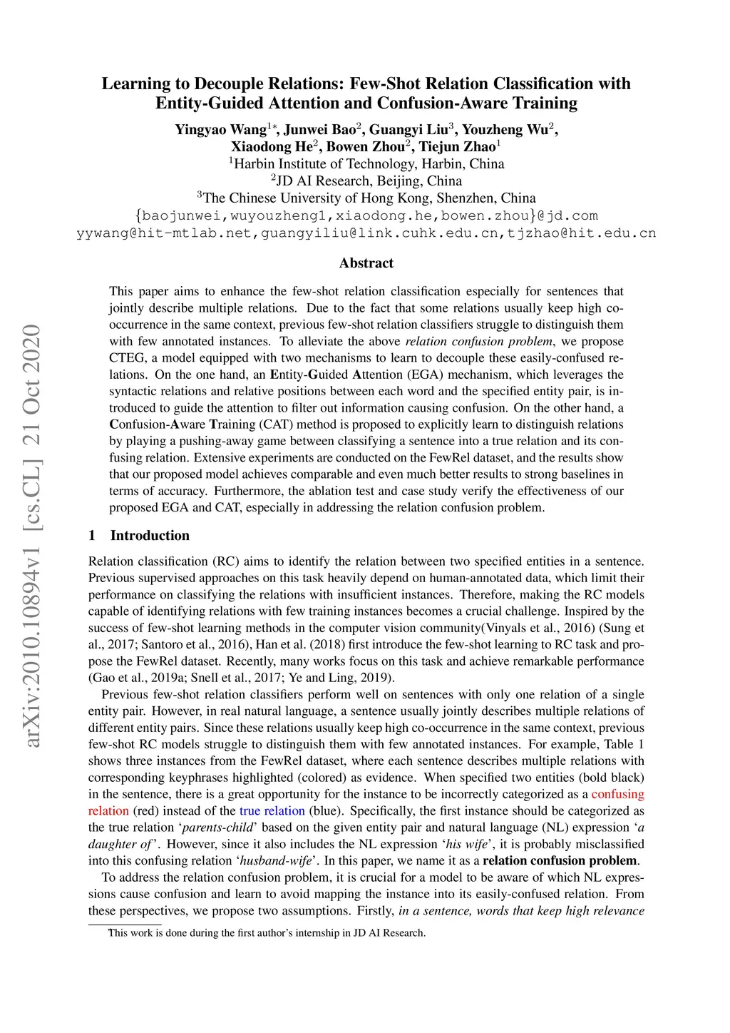 This paper aims to enhance the few-shot relation classification especially for sentences that jointly describe multiple relations. Due to the fact that some relations usually keep high co-occurrence in the same context, previous few-shot relation classifiers struggle to distinguish them with few annotated instances. To alleviate the above relation confusion problem, we propose CTEG, a model equipped with two mechanisms to learn to decouple these easily-confused relations. On the one hand, an Entity-Guided Attention (EGA) mechanism, which leverages the syntactic relations and relative positions between each word and the specified entity pair, is introduced to guide the attention to filter out information causing confusion. On the other hand, a Confusion-Aware Training (CAT) method is proposed to explicitly learn to distinguish relations by playing a pushing-away game between classifying a sentence into a true relation and its confusing relation. Extensive experiments are conducted on the FewRel dataset, and the results show that our proposed model achieves comparable and even much better results to strong baselines in terms of accuracy. Furthermore, the ablation test and case study verify the effectiveness of our proposed EGA and CAT, especially in addressing the relation confusion problem.