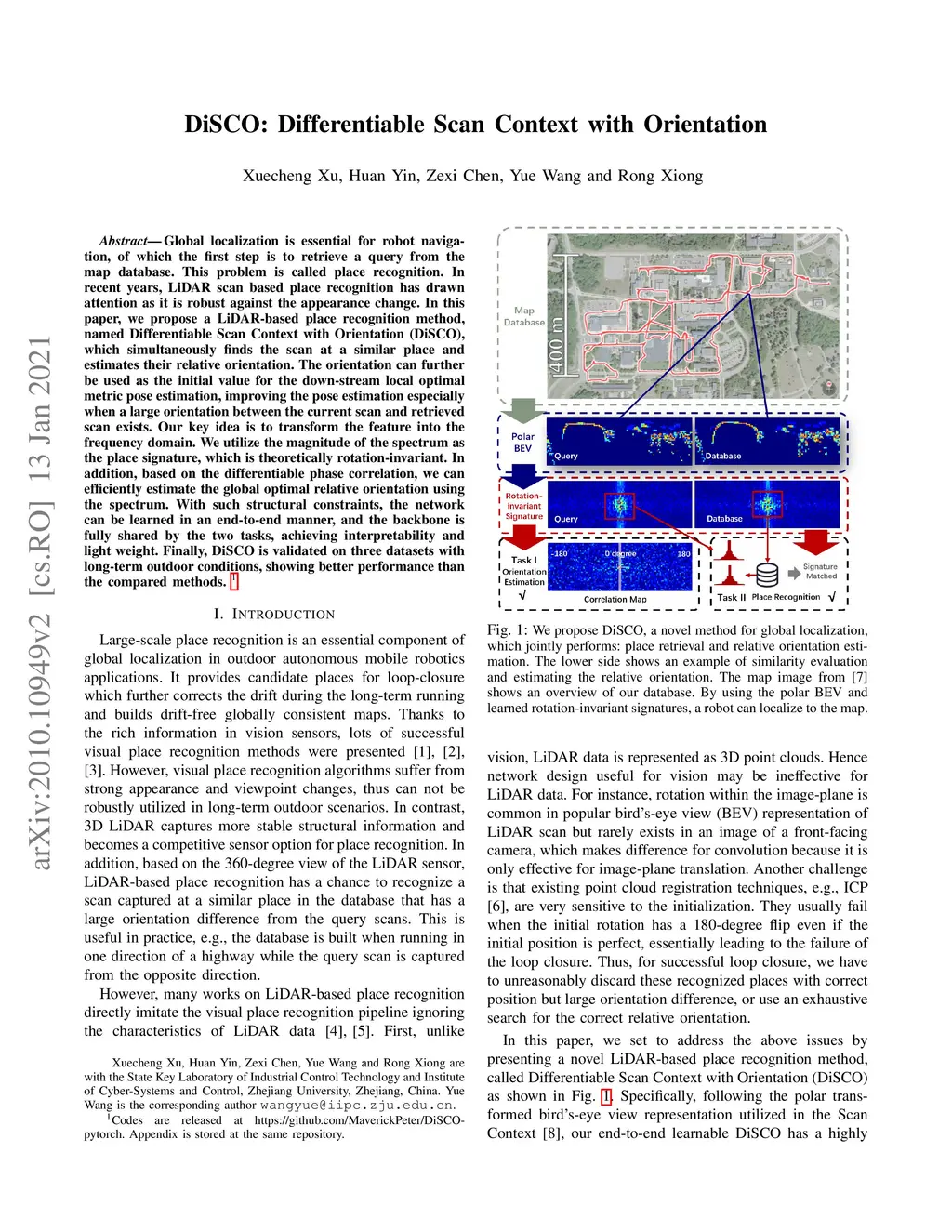Global localization is essential for robot navigation, of which the first step is to retrieve a query from the map database. This problem is called place recognition. In recent years, LiDAR scan based place recognition has drawn attention as it is robust against the appearance change. In this paper, we propose a LiDAR-based place recognition method, named Differentiable Scan Context with Orientation (DiSCO), which simultaneously finds the scan at a similar place and estimates their relative orientation. The orientation can further be used as the initial value for the down-stream local optimal metric pose estimation, improving the pose estimation especially when a large orientation between the current scan and retrieved scan exists. Our key idea is to transform the feature into the frequency domain. We utilize the magnitude of the spectrum as the place signature, which is theoretically rotation-invariant. In addition, based on the differentiable phase correlation, we can efficiently estimate the global optimal relative orientation using the spectrum. With such structural constraints, the network can be learned in an end-to-end manner, and the backbone is fully shared by the two tasks, achieving interpretability and light weight. Finally, DiSCO is validated on three datasets with long-term outdoor conditions, showing better performance than the compared methods.