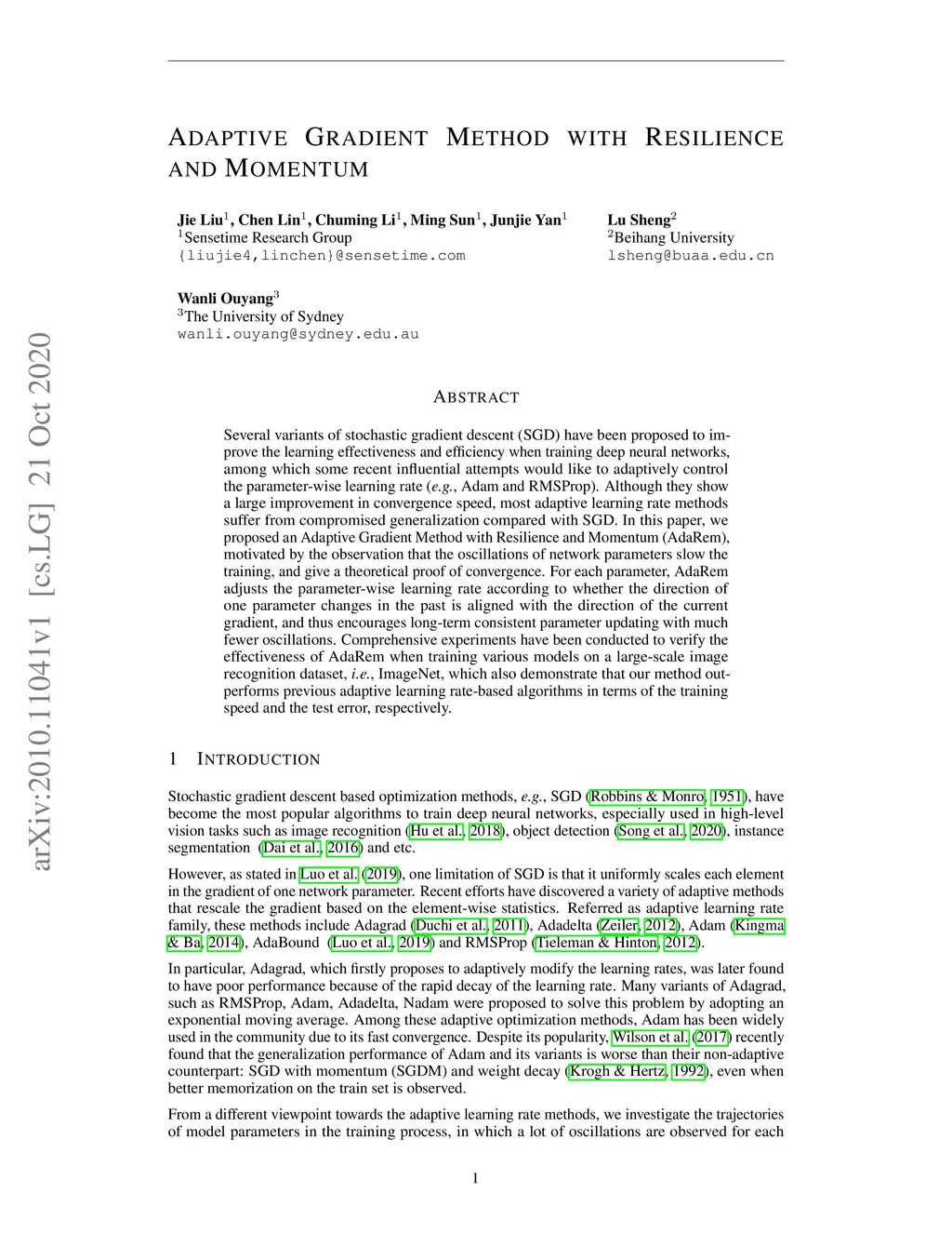 Several variants of stochastic gradient descent (SGD) have been proposed to improve the learning effectiveness and efficiency when training deep neural networks, among which some recent influential attempts would like to adaptively control the parameter-wise learning rate (e.g., Adam and RMSProp). Although they show a large improvement in convergence speed, most adaptive learning rate methods suffer from compromised generalization compared with SGD. In this paper, we proposed an Adaptive Gradient Method with Resilience and Momentum (AdaRem), motivated by the observation that the oscillations of network parameters slow the training, and give a theoretical proof of convergence. For each parameter, AdaRem adjusts the parameter-wise learning rate according to whether the direction of one parameter changes in the past is aligned with the direction of the current gradient, and thus encourages long-term consistent parameter updating with much fewer oscillations. Comprehensive experiments have been conducted to verify the effectiveness of AdaRem when training various models on a large-scale image recognition dataset, e.g., ImageNet, which also demonstrate that our method outperforms previous adaptive learning rate-based algorithms in terms of the training speed and the test error, respectively.