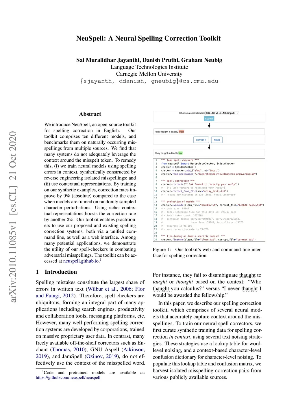We introduce NeuSpell, an open-source toolkit for spelling correction in English. Our toolkit comprises ten different models, and benchmarks them on naturally occurring misspellings from multiple sources. We find that many systems do not adequately leverage the context around the misspelt token. To remedy this, (i) we train neural models using spelling errors in context, synthetically constructed by reverse engineering isolated misspellings; and (ii) use contextual representations. By training on our synthetic examples, correction rates improve by 9% (absolute) compared to the case when models are trained on randomly sampled character perturbations. Using richer contextual representations boosts the correction rate by another 3%. Our toolkit enables practitioners to use our proposed and existing spelling correction systems, both via a unified command line, as well as a web interface. Among many potential applications, we demonstrate the utility of our spell-checkers in combating adversarial misspellings. The toolkit can be accessed at neuspell.github.io. Code and pretrained models are available at http://github.com/neuspell/neuspell.