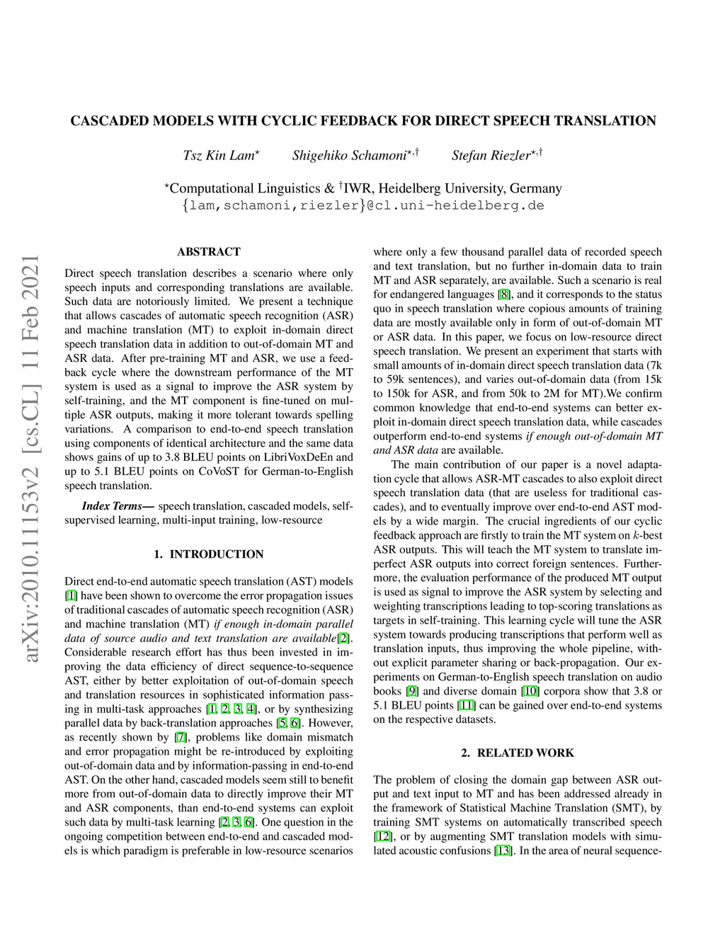 Cascaded Models With Cyclic Feedback For Direct Speech Translation