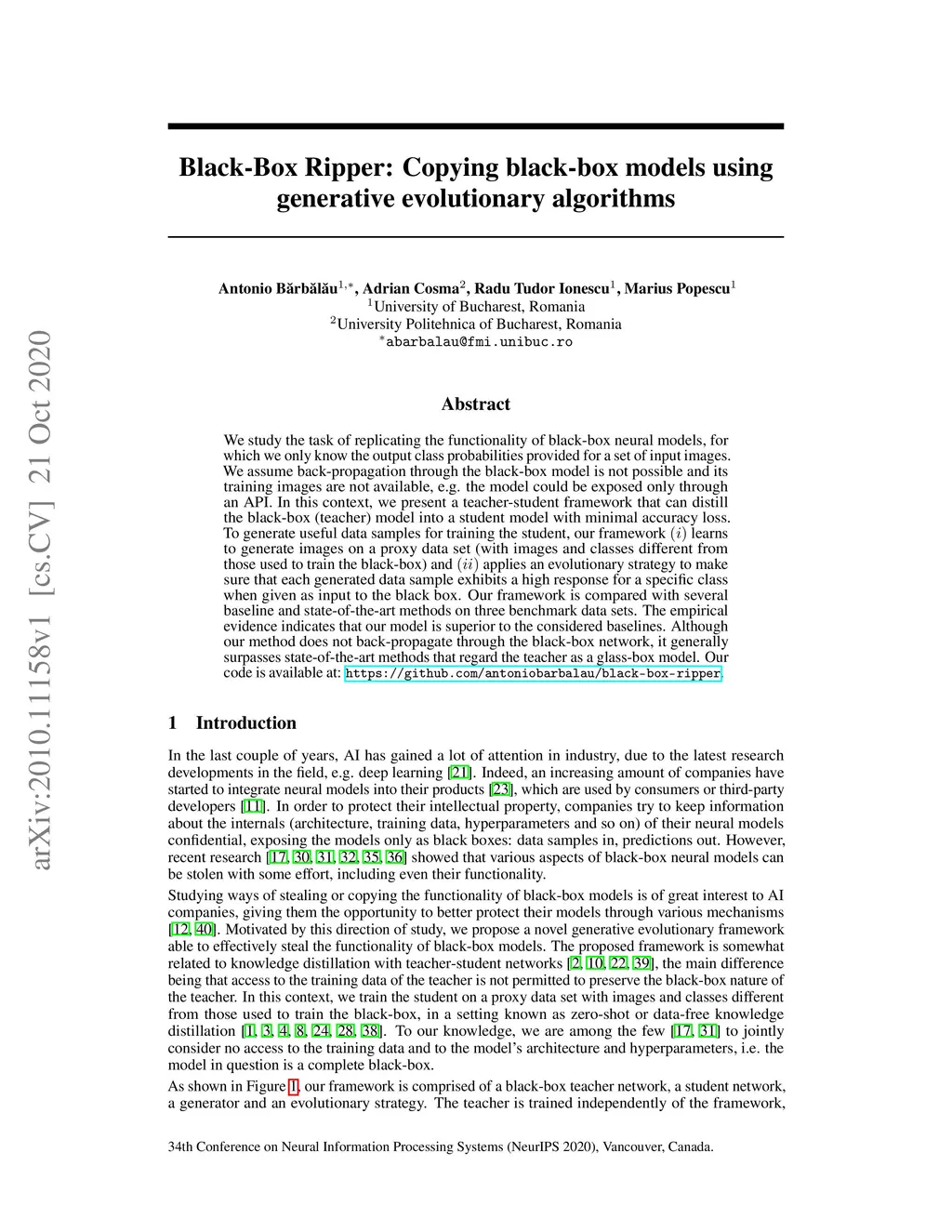 We study the task of replicating the functionality of black-box neural models, for which we only know the output class probabilities provided for a set of input images. We assume back-propagation through the black-box model is not possible and its training images are not available, e.g. the model could be exposed only through an API. In this context, we present a teacher-student framework that can distill the black-box (teacher) model into a student model with minimal accuracy loss. To generate useful data samples for training the student, our framework (i) learns to generate images on a proxy data set (with images and classes different from those used to train the black-box) and (ii) applies an evolutionary strategy to make sure that each generated data sample exhibits a high response for a specific class when given as input to the black box. Our framework is compared with several baseline and state-of-the-art methods on three benchmark data sets. The empirical evidence indicates that our model is superior to the considered baselines. Although our method does not back-propagate through the black-box network, it generally surpasses state-of-the-art methods that regard the teacher as a glass-box model. Our code is available at: https://github.com/antoniobarbalau/black-box-ripper.