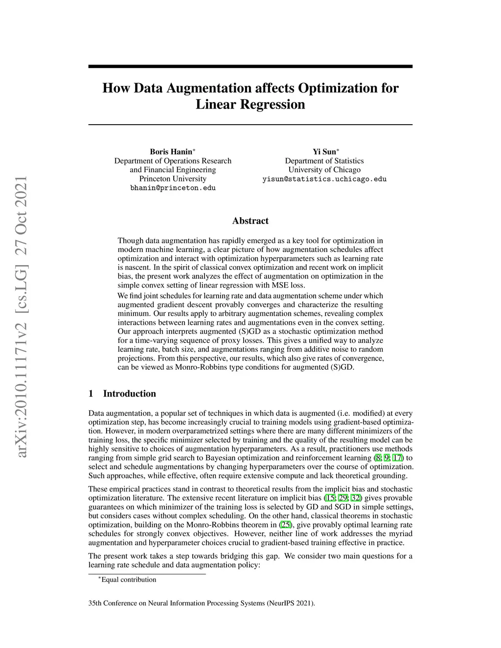 Though data augmentation has rapidly emerged as a key tool for optimization in modern machine learning, a clear picture of how augmentation schedules affect optimization and interact with optimization hyperparameters such as learning rate is nascent. In the spirit of classical convex optimization and recent work on implicit bias, the present work analyzes the effect of augmentation on optimization in the simple convex setting of linear regression with MSE loss. We find joint schedules for learning rate and data augmentation scheme under which augmented gradient descent provably converges and characterize the resulting minimum. Our results apply to arbitrary augmentation schemes, revealing complex interactions between learning rates and augmentations even in the convex setting. Our approach interprets augmented (S)GD as a stochastic optimization method for a time-varying sequence of proxy losses. This gives a unified way to analyze learning rate, batch size, and augmentations ranging from additive noise to random projections. From this perspective, our results, which also give rates of convergence, can be viewed as Monro-Robbins type conditions for augmented (S)GD.