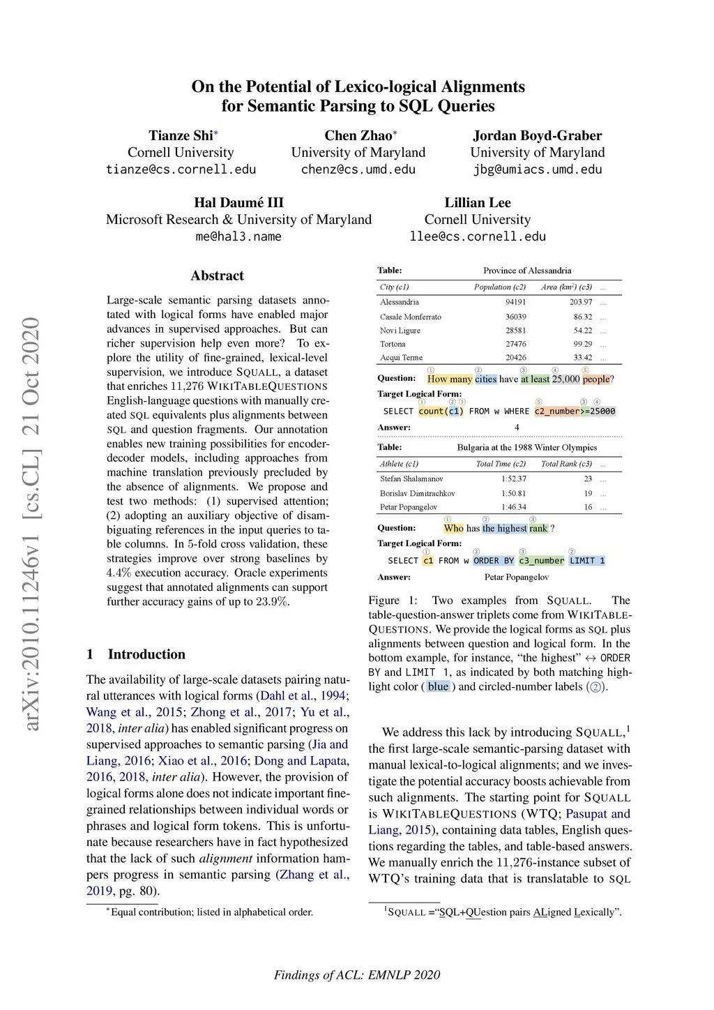 Large-scale semantic parsing datasets annotated with logical forms have enabled major advances in supervised approaches. But can richer supervision help even more? To explore the utility of fine-grained, lexical-level supervision, we introduce Squall, a dataset that enriches 11,276 WikiTableQuestions English-language questions with manually created SQL equivalents plus alignments between SQL and question fragments. Our annotation enables new training possibilities for encoder-decoder models, including approaches from machine translation previously precluded by the absence of alignments. We propose and test two methods: (1) supervised attention; (2) adopting an auxiliary objective of disambiguating references in the input queries to table columns. In 5-fold cross validation, these strategies improve over strong baselines by 4.4% execution accuracy. Oracle experiments suggest that annotated alignments can support further accuracy gains of up to 23.9%.