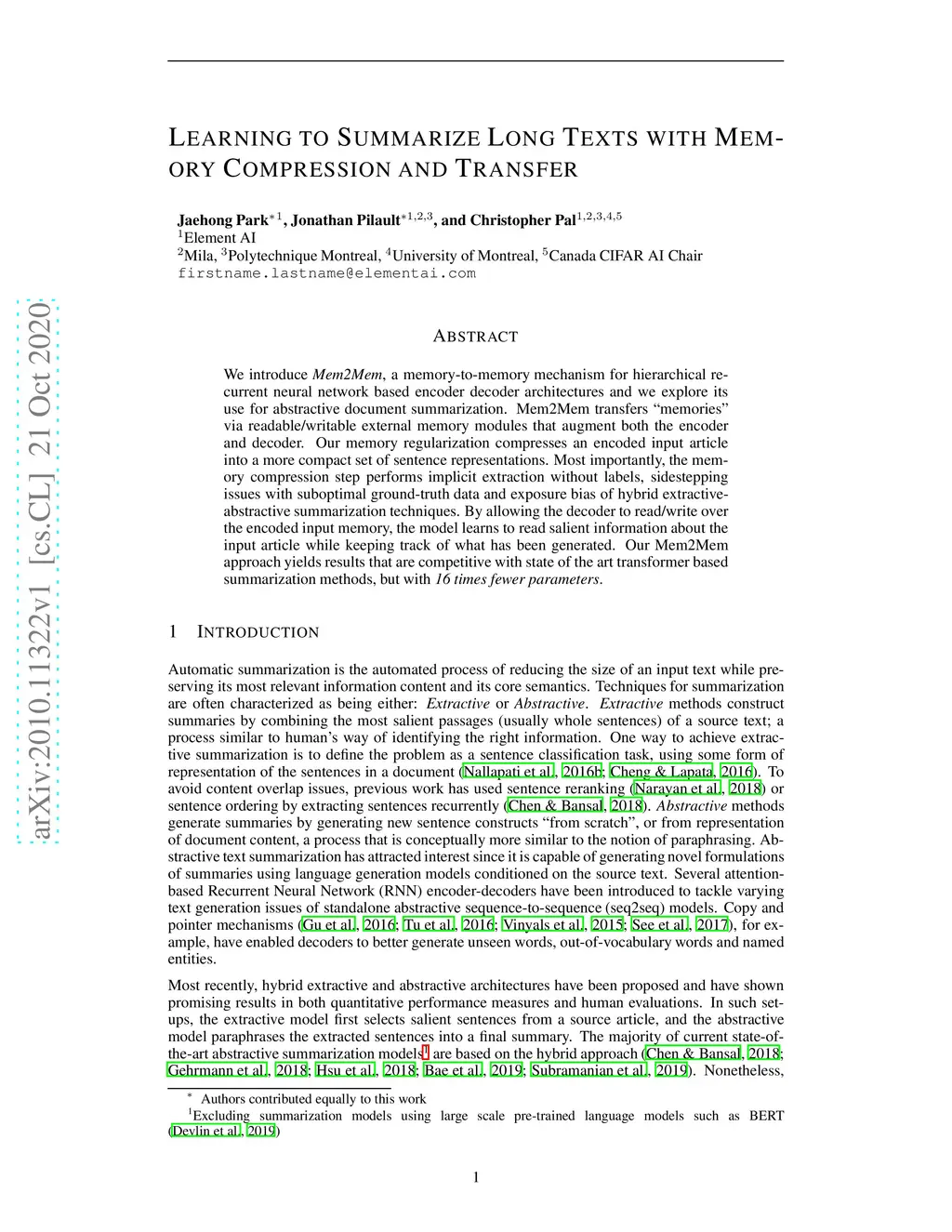 We introduce Mem2Mem, a memory-to-memory mechanism for hierarchical recurrent neural network based encoder decoder architectures and we explore its use for abstractive document summarization. Mem2Mem transfers "memories" via readable/writable external memory modules that augment both the encoder and decoder. Our memory regularization compresses an encoded input article into a more compact set of sentence representations. Most importantly, the memory compression step performs implicit extraction without labels, sidestepping issues with suboptimal ground-truth data and exposure bias of hybrid extractive-abstractive summarization techniques. By allowing the decoder to read/write over the encoded input memory, the model learns to read salient information about the input article while keeping track of what has been generated. Our Mem2Mem approach yields results that are competitive with state of the art transformer based summarization methods, but with 16 times fewer parameters