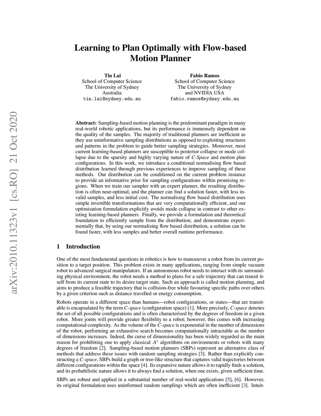 Sampling-based motion planning is the predominant paradigm in many real-world robotic applications, but its performance is immensely dependent on the quality of the samples. The majority of traditional planners are inefficient as they use uninformative sampling distributions as opposed to exploiting structures and patterns in the problem to guide better sampling strategies. Moreover, most current learning-based planners are susceptible to posterior collapse or mode collapse due to the sparsity and highly varying nature of C-Space and motion plan configurations. In this work, we introduce a conditional normalising flow based distribution learned through previous experiences to improve sampling of these methods. Our distribution can be conditioned on the current problem instance to provide an informative prior for sampling configurations within promising regions. When we train our sampler with an expert planner, the resulting distribution is often near-optimal, and the planner can find a solution faster, with less invalid samples, and less initial cost. The normalising flow based distribution uses simple invertible transformations that are very computationally efficient, and our optimisation formulation explicitly avoids mode collapse in contrast to other existing learning-based planners. Finally, we provide a formulation and theoretical foundation to efficiently sample from the distribution; and demonstrate experimentally that, by using our normalising flow based distribution, a solution can be found faster, with less samples and better overall runtime performance.