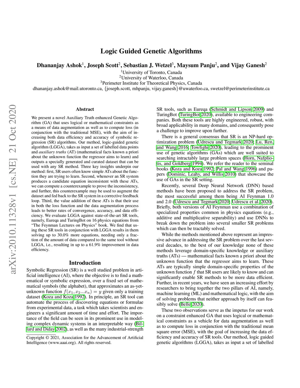 We present a novel Auxiliary Truth enhanced Genetic Algorithm (GA) that uses logical or mathematical constraints as a means of data augmentation as well as to compute loss (in conjunction with the traditional MSE), with the aim of increasing both data efficiency and accuracy of symbolic regression (SR) algorithms. Our method, logic-guided genetic algorithm (LGGA), takes as input a set of labelled data points and auxiliary truths (ATs) (mathematical facts known a priori about the unknown function the regressor aims to learn) and outputs a specially generated and curated dataset that can be used with any SR method. Three key insights underpin our method: first, SR users often know simple ATs about the function they are trying to learn. Second, whenever an SR system produces a candidate equation inconsistent with these ATs, we can compute a counterexample to prove the inconsistency, and further, this counterexample may be used to augment the dataset and fed back to the SR system in a corrective feedback loop. Third, the value addition of these ATs is that their use in both the loss function and the data augmentation process leads to better rates of convergence, accuracy, and data efficiency. We evaluate LGGA against state-of-the-art SR tools, namely, Eureqa and TuringBot on 16 physics equations from "The Feynman Lectures on Physics" book. We find that using these SR tools in conjunction with LGGA results in them solving up to 30.0% more equations, needing only a fraction of the amount of data compared to the same tool without LGGA, i.e., resulting in up to a 61.9% improvement in data efficiency.