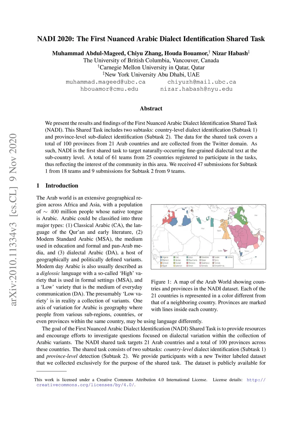 NADI 2020: The First Nuanced Arabic Dialect Identification Shared Task