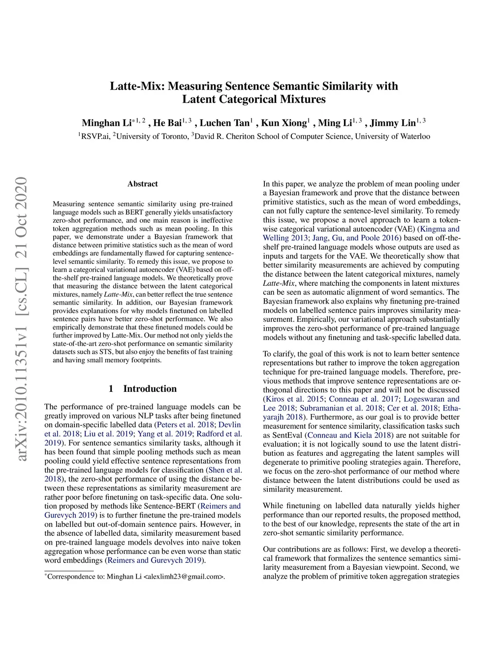 Measuring sentence semantic similarity using pre-trained language models such as BERT generally yields unsatisfactory zero-shot performance, and one main reason is ineffective token aggregation methods such as mean pooling. In this paper, we demonstrate under a Bayesian framework that distance between primitive statistics such as the mean of word embeddings are fundamentally flawed for capturing sentence-level semantic similarity. To remedy this issue, we propose to learn a categorical variational autoencoder (VAE) based on off-the-shelf pre-trained language models. We theoretically prove that measuring the distance between the latent categorical mixtures, namely Latte-Mix, can better reflect the true sentence semantic similarity. In addition, our Bayesian framework provides explanations for why models finetuned on labelled sentence pairs have better zero-shot performance. We also empirically demonstrate that these finetuned models could be further improved by Latte-Mix. Our method not only yields the state-of-the-art zero-shot performance on semantic similarity datasets such as STS, but also enjoy the benefits of fast training and having small memory footprints.