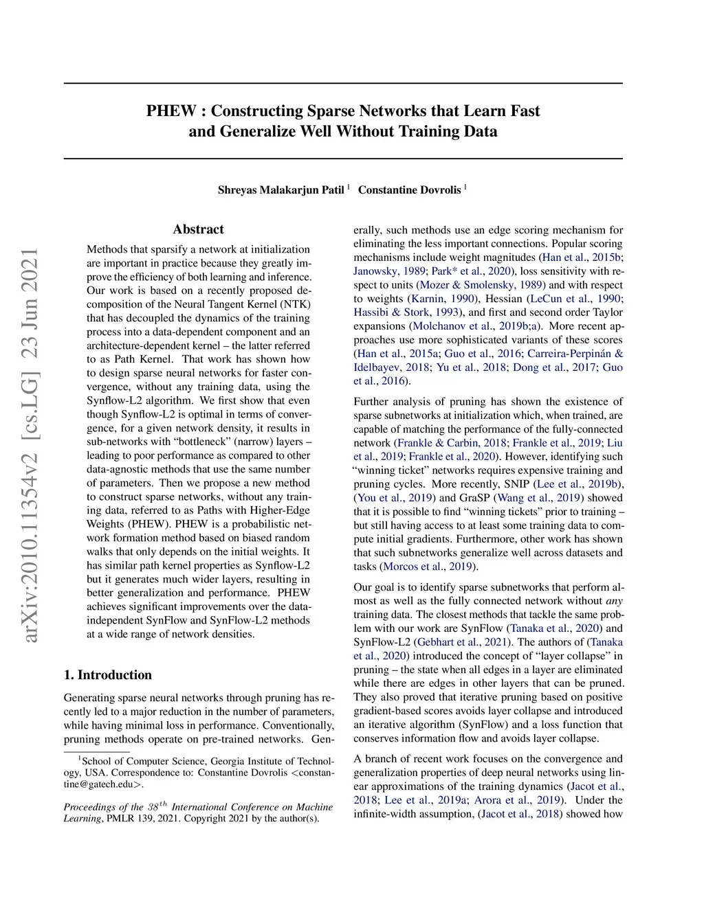 PHEW: Constructing Sparse Networks that Learn Fast and Generalize Well