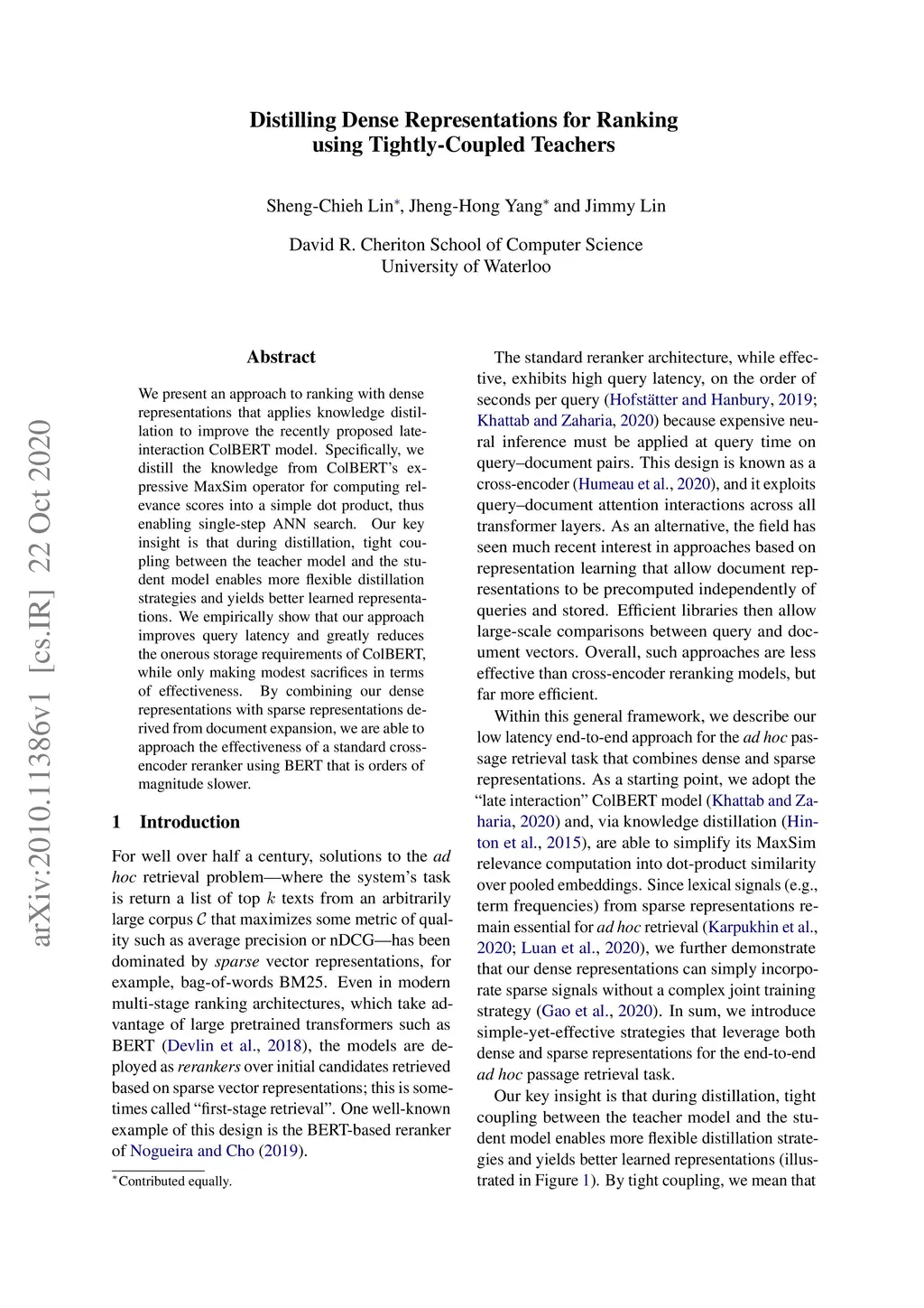 We present an approach to ranking with dense representations that applies knowledge distillation to improve the recently proposed late-interaction ColBERT model. Specifically, we distill the knowledge from ColBERT's expressive MaxSim operator for computing relevance scores into a simple dot product, thus enabling single-step ANN search. Our key insight is that during distillation, tight coupling between the teacher model and the student model enables more flexible distillation strategies and yields better learned representations. We empirically show that our approach improves query latency and greatly reduces the onerous storage requirements of ColBERT, while only making modest sacrifices in terms of effectiveness. By combining our dense representations with sparse representations derived from document expansion, we are able to approach the effectiveness of a standard cross-encoder reranker using BERT that is orders of magnitude slower.
