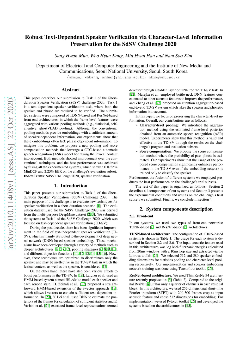 This paper describes our submission to Task 1 of the Short-duration Speaker Verification (SdSV) challenge 2020. Task 1 is a text-dependent speaker verification task, where both the speaker and phrase are required to be verified. The submitted systems were composed of TDNN-based and ResNet-based front-end architectures, in which the frame-level features were aggregated with various pooling methods (e.g., statistical, self-attentive, ghostVLAD pooling). Although the conventional pooling methods provide embeddings with a sufficient amount of speaker-dependent information, our experiments show that these embeddings often lack phrase-dependent information. To mitigate this problem, we propose a new pooling and score compensation methods that leverage a CTC-based automatic speech recognition (ASR) model for taking the lexical content into account. Both methods showed improvement over the conventional techniques, and the best performance was achieved by fusing all the experimented systems, which showed 0.0785% MinDCF and 2.23% EER on the challenge's evaluation subset.