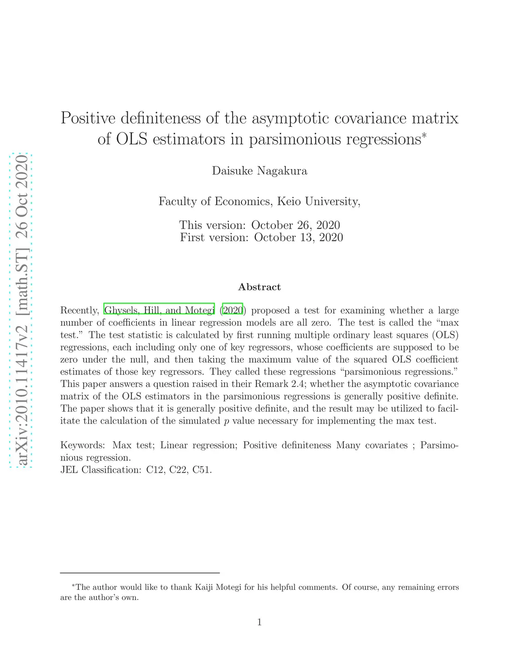 Recently, Ghysels, Hill, and Motegi (2020) proposed a test for examining whether a large number of coefficients in linear regression models is zero. The test is called the max test. The test statistic is calculated by first running multiple ordinary least squares (OLS) regressions, each including only one of key regressors, whose coefficients are supposed to be zero under the null, and then taking the maximum value of the squared OLS coefficient estimates of those key regressors. They called these regressions parsimonious regressions. This paper answers a question raised in their Remark 2.4; whether the asymptotic covariance matrix of the OLS estimators in the parsimonious regressions is generally positive definite. The paper shows that it is generally positive definite, and the result may be utilized to facilitate the calculation of the simulated p value necessary for implementing the max test.
