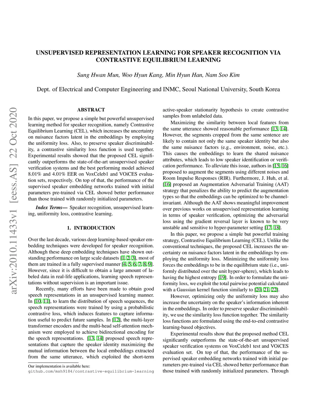 In this paper, we propose a simple but powerful unsupervised learning method for speaker recognition, namely Contrastive Equilibrium Learning (CEL), which increases the uncertainty on nuisance factors latent in the embeddings by employing the uniformity loss. Also, to preserve speaker discriminability, a contrastive similarity loss function is used together. Experimental results showed that the proposed CEL significantly outperforms the state-of-the-art unsupervised speaker verification systems and the best performing model achieved 8.01% and 4.01% EER on VoxCeleb1 and VOiCES evaluation sets, respectively. On top of that, the performance of the supervised speaker embedding networks trained with initial parameters pre-trained via CEL showed better performance than those trained with randomly initialized parameters.