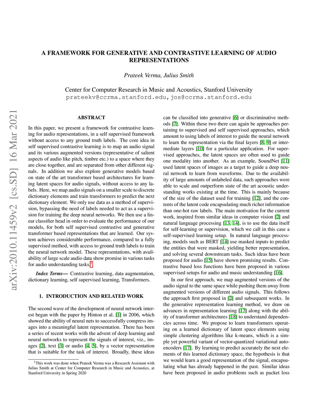 In this paper, we present a framework for contrastive learning for audio representations, in a self supervised frame work without access to any ground truth labels. The core idea in self supervised contrastive learning is to map an audio signal and its various augmented versions (representative of salient aspects of audio like pitch, timbre etc.) to a space where they are close together, and are separated from other different signals. In addition we also explore generative models based on state of the art transformer based architectures for learning latent spaces for audio signals, without access to any labels. Here, we map audio signals on a smaller scale to discrete dictionary elements and train transformers to predict the next dictionary element. We only use data as a method of supervision, bypassing the need of labels needed to act as a supervision for training the deep neural networks. We then use a linear classifier head in order to evaluate the performance of our models, for both self supervised contrastive and generative transformer based representations that are learned. Our system achieves considerable performance, compared to a fully supervised method, with access to ground truth labels to train the neural network model. These representations, with avail-ability of large scale audio data show promise in various tasks for audio understanding tasks
