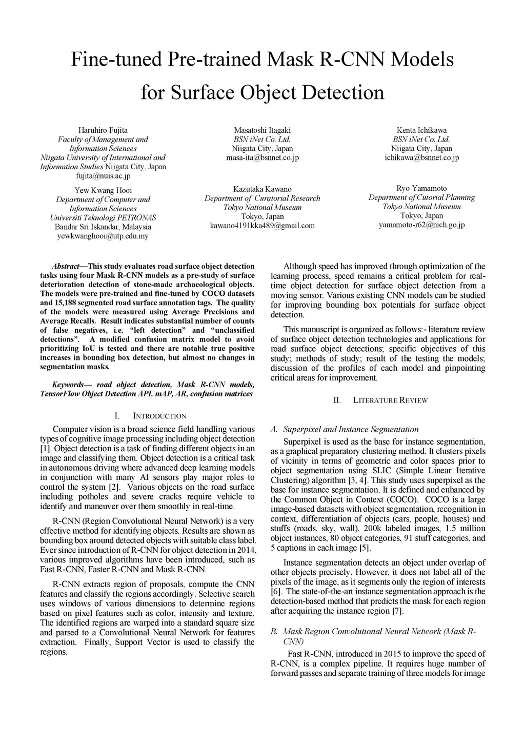 This study evaluates road surface object detection tasks using four Mask R-CNN models as a pre-study of surface deterioration detection of stone-made archaeological objects. The models were pre-trained and fine-tuned by COCO datasets and 15,188 segmented road surface annotation tags. The quality of the models were measured using Average Precisions and Average Recalls. Result indicates substantial number of counts of false negatives, i.e. left detection and unclassified detections. A modified confusion matrix model to avoid prioritizing IoU is tested and there are notable true positive increases in bounding box detection, but almost no changes in segmentation masks.
